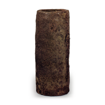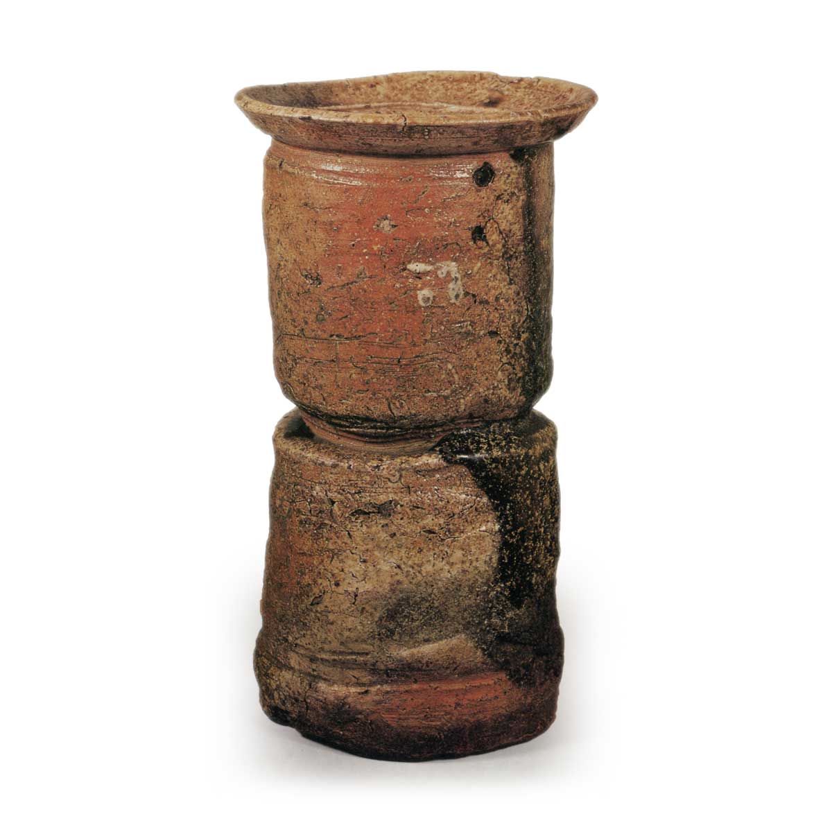 信乐花器 信乐信乐花器 X Facebook Hatena Bookmark LINE Pinterest 复制 2025.09.12 信乐花器 高25.9厘米 口径14.6厘米 底径12.0厘米北陆大学筒形花瓶主体中部收束一圈,瓶口锐利外翻。其造型与相传利休所藏伊贺烧花瓶相似,或为伊贺槇山窑所制,然作为信乐花瓶流传至今。应为天正年间后期作品。自口部至裙缘,暗绿色灰釉如瀑布般倾泻而下,另一侧则显露出赤红的烧结土胎,堪称信乐花器中罕见的精湛之作。平底处有两道粗大的窑裂纹,口部前后还留有填补纹付孔的痕迹,由此可知此器曾作为挂花器使用。