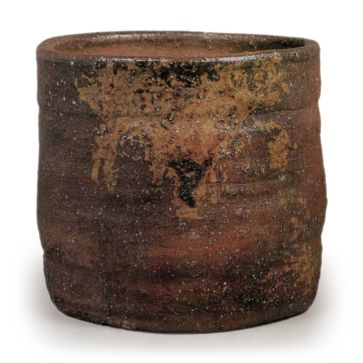 信乐单口水指 铭礒清水 信乐信乐单口水指 铭礒清水 2025.09.122025.11.14 信乐单口水指 铭礒清水 高15.7厘米 口径17.0厘米 底径16.1㎝此亦传为利休所藏水指,另有传闻称“杨贵妃”“风折”“礒シミヅ”,或称“风折”‘礒シミヅ’“三夕”为千家名物三水指。由此可见,若将“柴庵”与“腰折”纳入其中,可见六件信乐水指被分为三组,每组三件被尊为三名物。鉴于这些水指均附有表千家六世觉觉斋原叟的题记,推测它们应是在原叟时代成为名物的。器形为简朴的筒状,以稍薄的植櫨泥料成形。整体胎体质地柔软,烧成暗褐色,从正面口部至筒身覆盖茶褐色釉料,是件侘味十足的水指。平底处显露出柔和的素胎肌理。