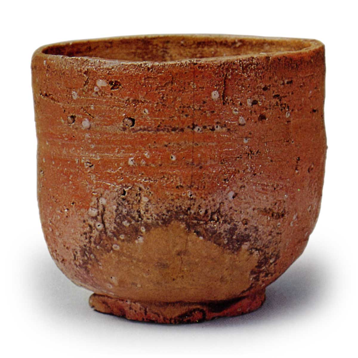 此茶碗腰部圆润,体态小巧,胎体略厚。高台形似手捏泥团般浑圆粗粝,向四方歪斜的姿态别具韵味。自碗身至碗底部分覆有灰釉形成斑驳景致,赤红烧结的胎体上散落着大小不一的白色长石颗粒,想必正是因这般景致而得名“水の子”。