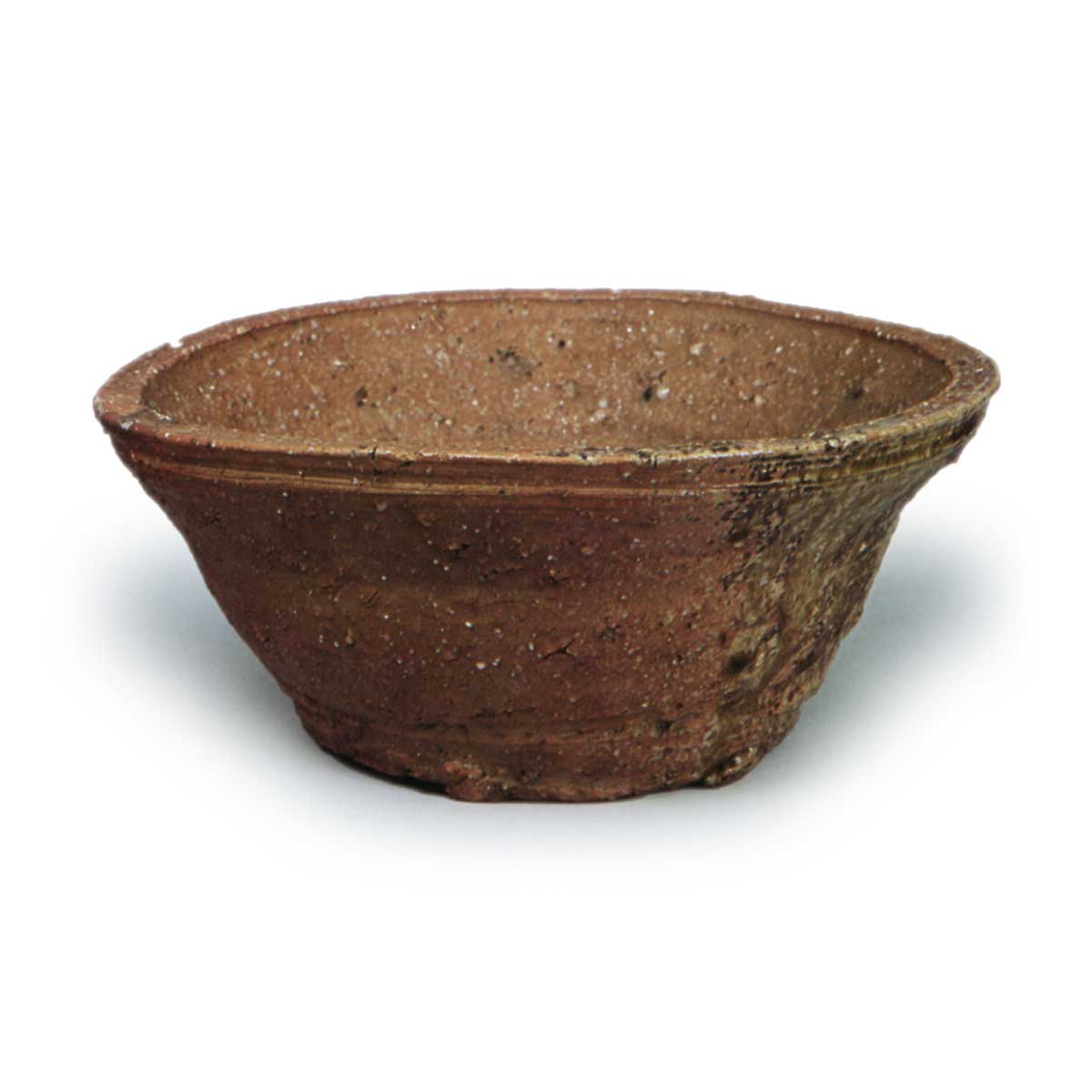 信乐水指 信乐信乐水指 2025.09.132025.11.14 信乐水指 高11.7厘米 口径25.0厘米 底径14.0厘米梅泽纪念馆此器虽作鬼桶风格,实为摇鉢形水指,即所谓擦盆水指形式。褐色灰釉单面施釉,胎体烧制呈赤红色。底刻“六”字铭文,推测为桃山时代作品。