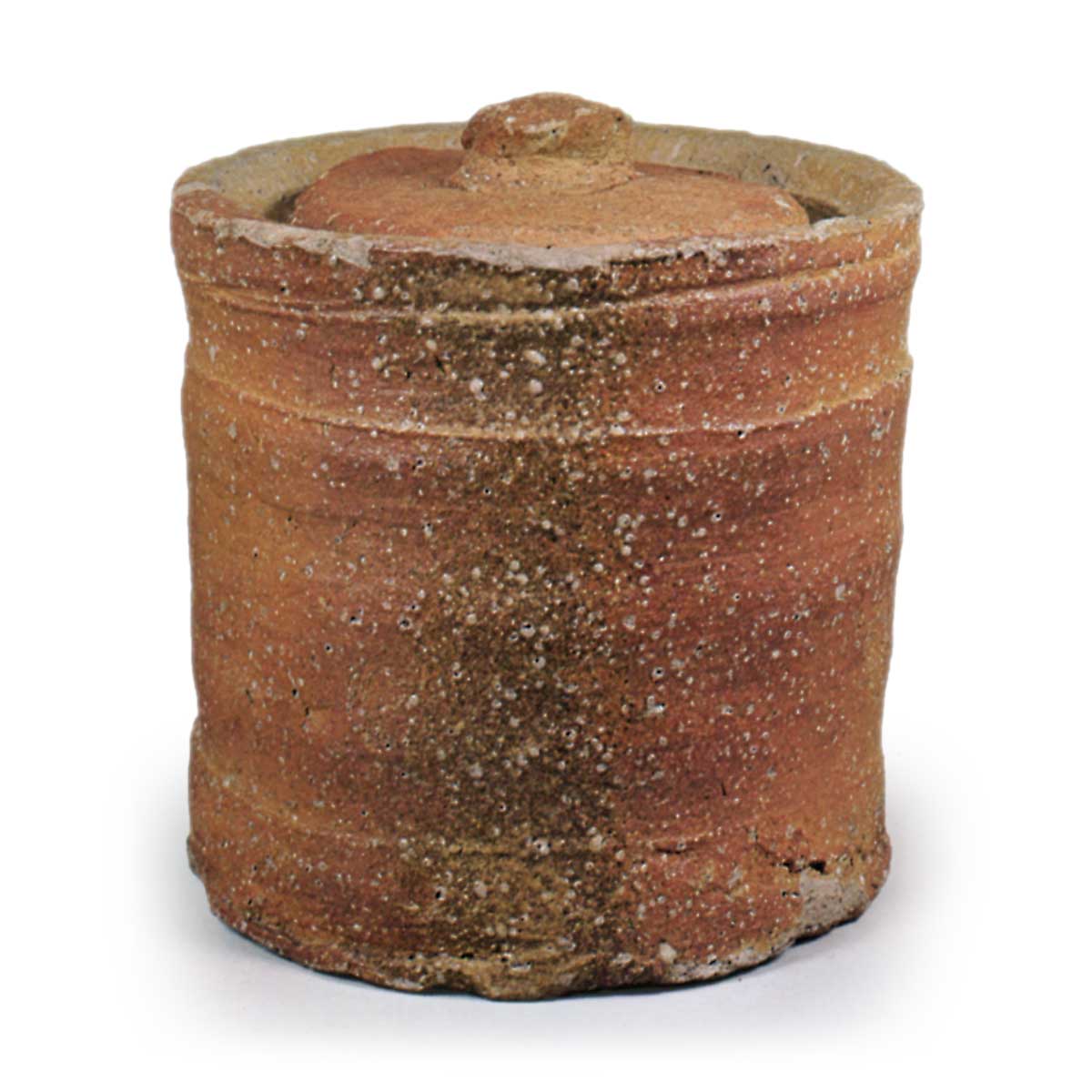 此器应为桃山时代后期作品,属信乐矢筈口水指的典型范例。尤为出众的是其陶胎肌理之美——正面泛着淡红的陶胎上,薄薄地覆盖着灰釉,呈现出焦黑的质感。值得玩味的是,在有来新兵卫宅邸遗址(京都市中京区三条柳马场东入)出土的器物与本品作风完全一致。新兵卫乃庆长年间活跃于京都的町众,既与德川家康有往来,亦与古田织部交好,是位雅好古物的奇人,据传经营二条的唐物商铺。其宅邸遗址出土过志野、瀨户黑、织部、备前等茶陶,推测他应是经营茶陶流通的町人,此类信乐陶器很可能也是其商品。但新兵卫本人似乎也尝试制陶,并会向窑场订购心仪的器型。关于新兵卫作品的具体归属,尚待今后深入考证。此器身部上下分设阶梯状台阶,口沿呈箭簇状。备前烧亦有类似器型,但信乐烧的器形更为纯粹。器内壁以砧凿刻有“シ”字印记,乃新兵卫的专属印章。配套盖亦经赤烧收缩处理。