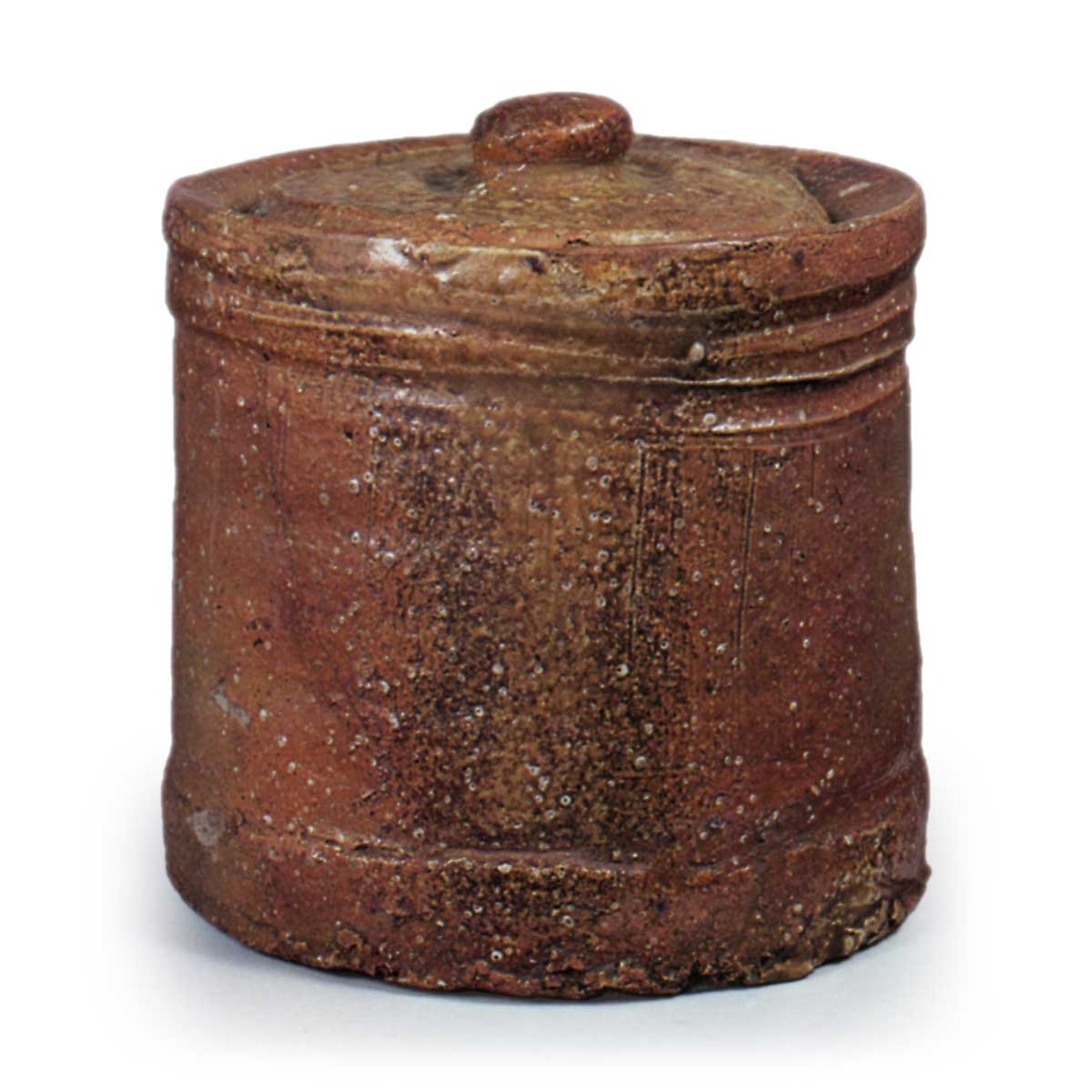 信乐矢筈口水指 信乐信乐矢筈口水指 2025.09.132025.11.14 信乐矢筈口水指 高18.5厘米 口径17.2厘米 底径17.2厘米表千家此为信乐矢筈口水指的典型作例,但略显矮小,胴体上部环绕着深邃的筅刻纹。胴体上还等距刻有细长的纵向线条,似为桶形纹样。陶土质地呈褐色且烧制坚实,口部与正面施有朽叶色灰釉。底部中央呈大圆形浅削,周边采用高台风造型。箱盖内侧有表千家九世了々斎宗左题写「信乐矢筈口水指 ふしん左(花押)」。内壁以筅刻技法刻有疑似窑印的「-」形标记。