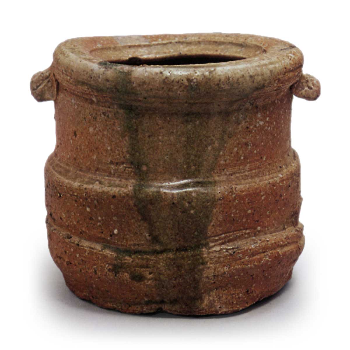 信乐带耳水指 信乐信乐带耳水指 2025.09.142025.11.14 信乐带耳水指 高19.2厘米 口径19.8厘米 左右22.7厘米 底径15.5厘米此为矢筈口水指,器身开两段阶,两侧附耳。信乐水指带耳者极为罕见,几乎不见同类例证。此乃造型大度、趣味盎然之水指。自口部至器身下缘,灰釉如倾泻般流淌,胎体呈赤色烧结。底部两处留有置痕。为名古屋关户家传世之物。