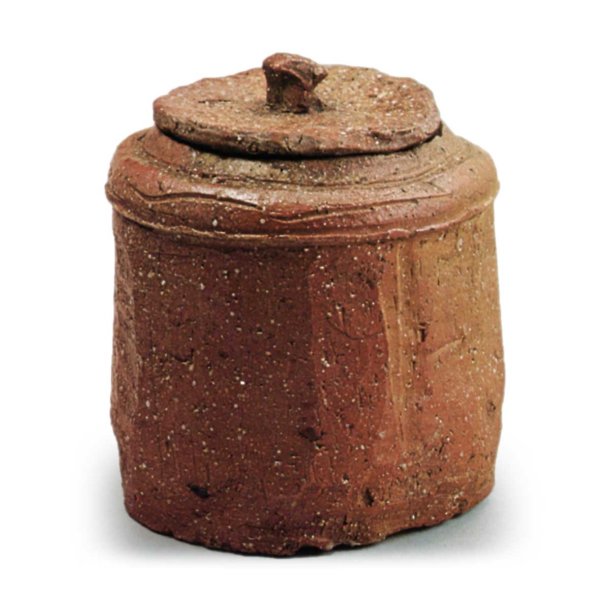 信乐水指 信乐信乐水指 2025.09.142025.11.14 信乐水指 高20.5厘米 口径13.4厘米 底径17.0厘米虽与“绯缀”同属赤陶质地,但此器肩部饰以圆润线刻纹样,胴身则施以粗犷的斜面刮刨纹。附同款盖,肩部薄施灰釉。口部造型为平直的樋口式。此类信乐水指中堪称制作精良之作,内壁饰有“×”形刮凿纹样。
