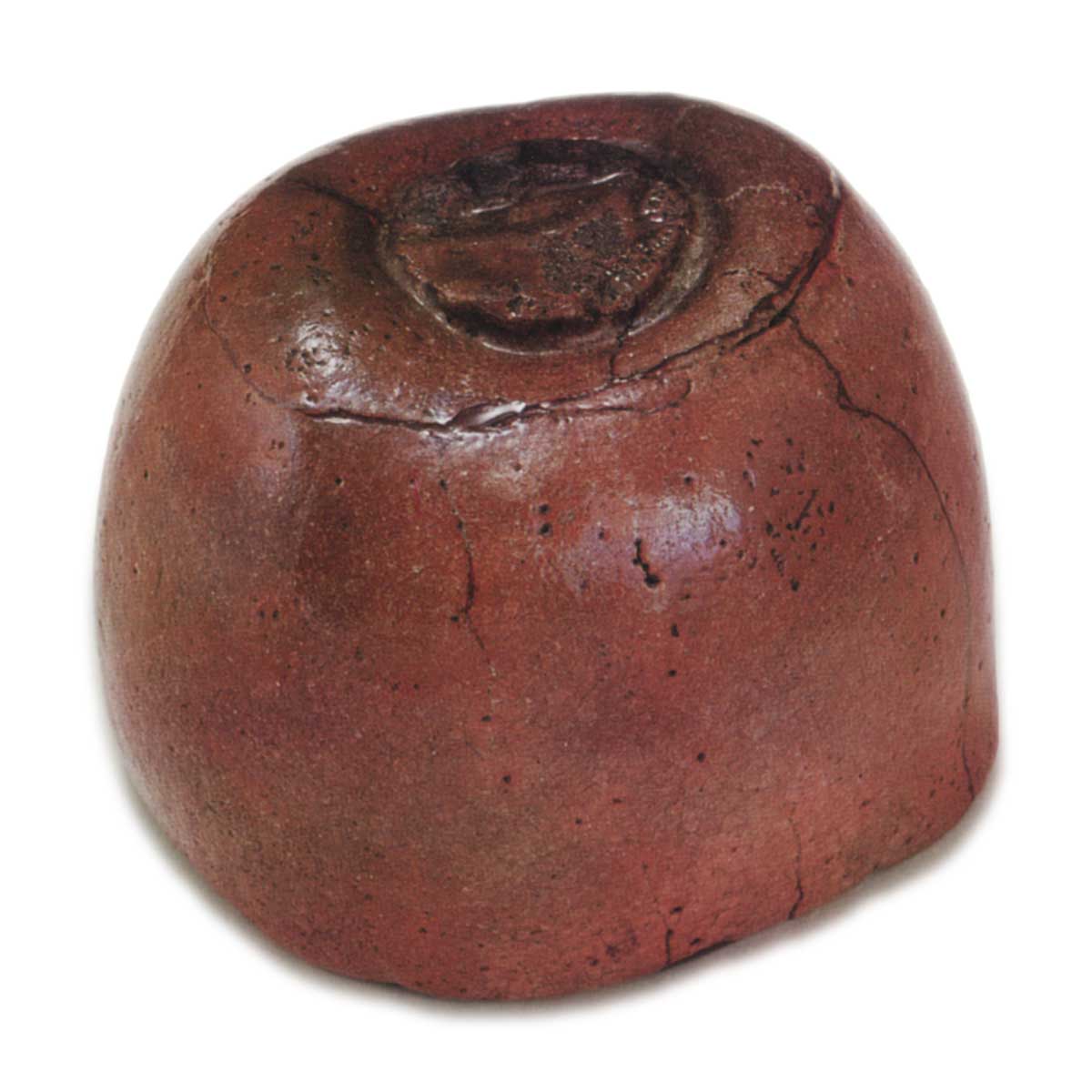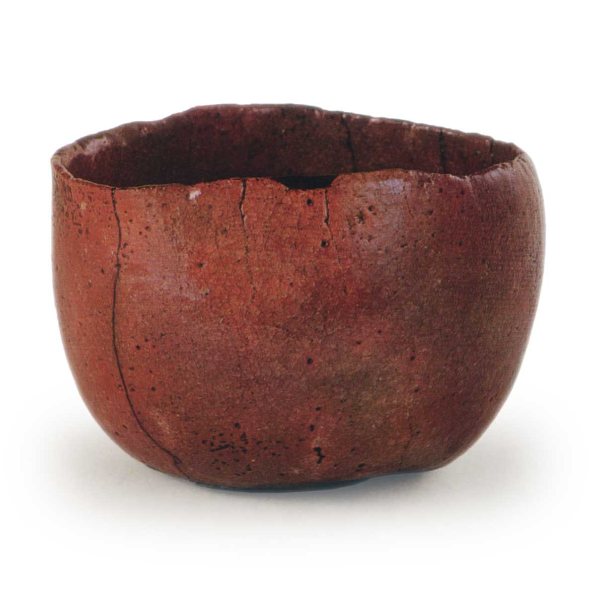 茶碗由粘性红土制成,并涂有一层厚厚的透明釉。 它似乎是在相当高的温度下烧制的,在当时属于红色的乐茶碗,釉面已经完美地熔化,形成玻璃状表面,表面遍布略微粗糙的裂纹。 釉面略带紫色,这是小悦的红乐茶碗的特征,在农乐的作品中看不到。 它的烧制温度可能比野古的赤乐茶碗更高。
