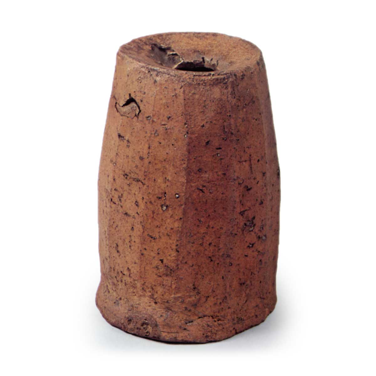 信乐面取挂花器 信乐信乐面取挂花器 2025.09.15 信乐面取挂花器 高15.6厘米 口径8.0厘米 底径10.9厘米北村美术馆此悬挂式花器以十一面体为器身,造型独特新颖,显然是专为插花而制。胎体与前图相似,完全未施釉,呈赤褐色柔和烧结质地。底面以刮刀刻有“L”形窑印。器身存有石哺痕迹,口部亦有小石脱落的遗迹。背面附有钦印。