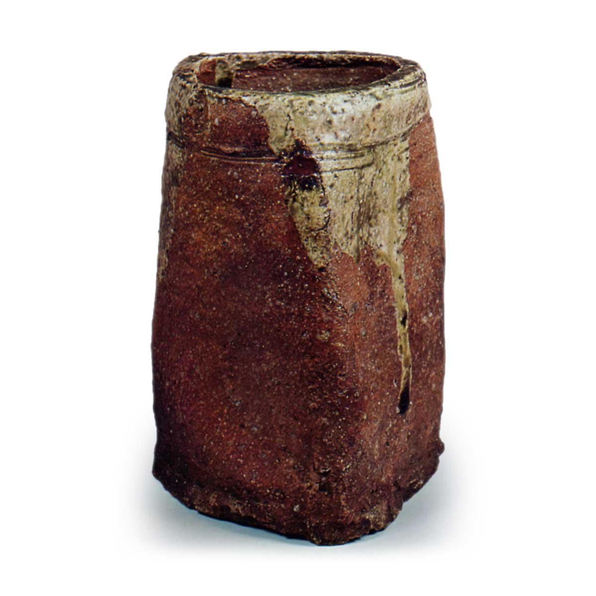 信乐三角花瓶 信乐信乐三角花瓶 2025.09.15 信乐三角花瓶 高20.2厘米 口径11.3厘米 底径12.8厘米此亦为三角花瓶,自口沿至瓶身施以灰釉流淌釉彩。胎体质地柔软且烧制致密,底面以粗犷的刮凿技法刻有“三”字,亦可能是“シ”字。一侧可见填补纹饰孔洞的痕迹。
