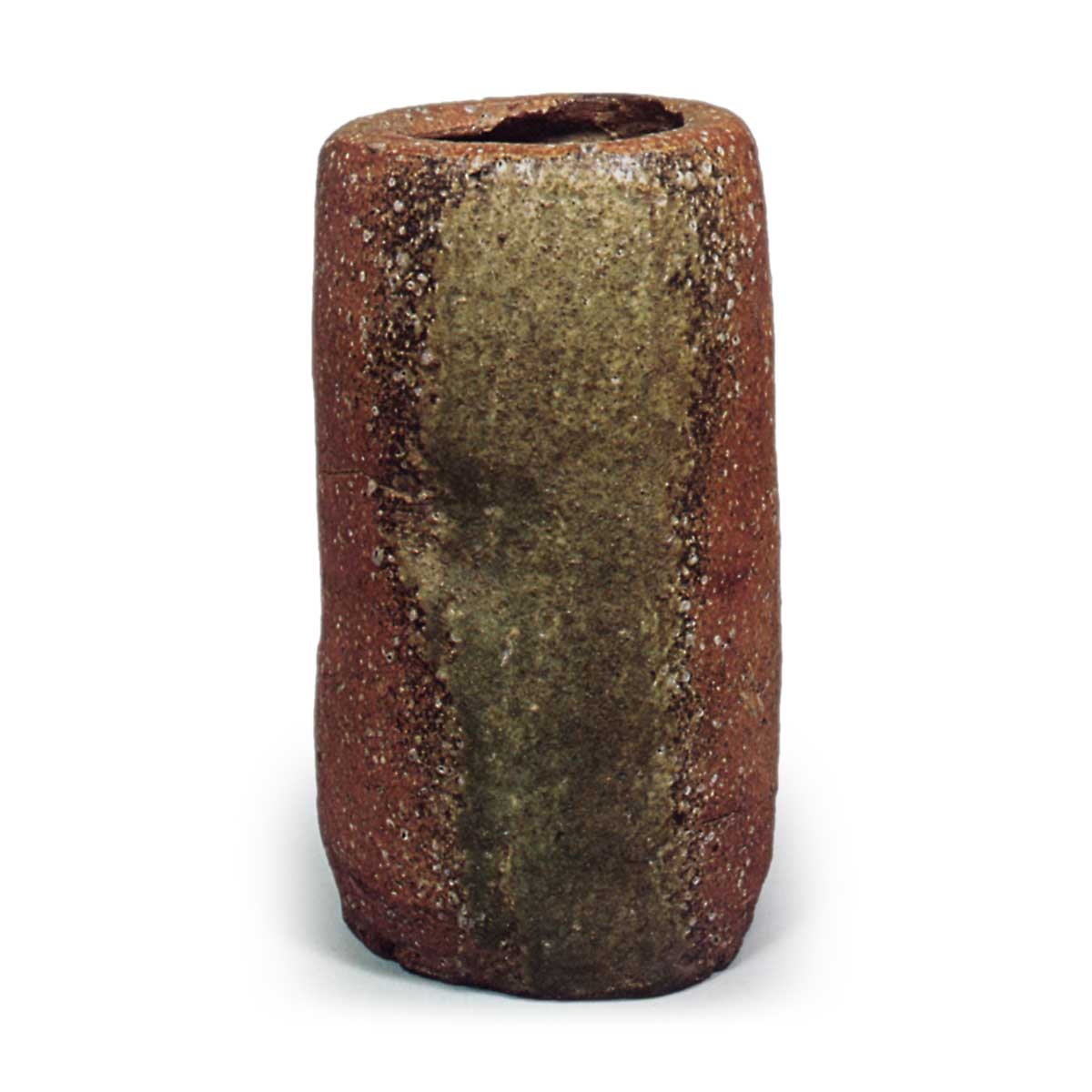 信乐旅枕花器 信乐信乐旅枕花器 X Facebook Hatena Bookmark LINE Pinterest 复制 2025.09.15 信乐旅枕花器 高20.3厘米 口径9.5厘米 底径10.7厘米此为姥口筒形,属典型的信乐筒挂花器。器身略带膨胀的造型尽显侘寂之趣,正面灰釉如瀑布般倾泻而下。背面设有执柄,另有填补孔洞的痕迹。烧肤质感与新兵卫信乐器相似。