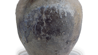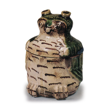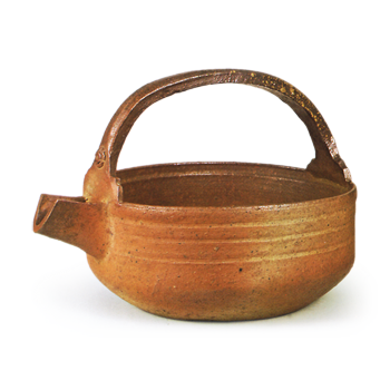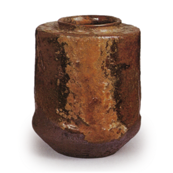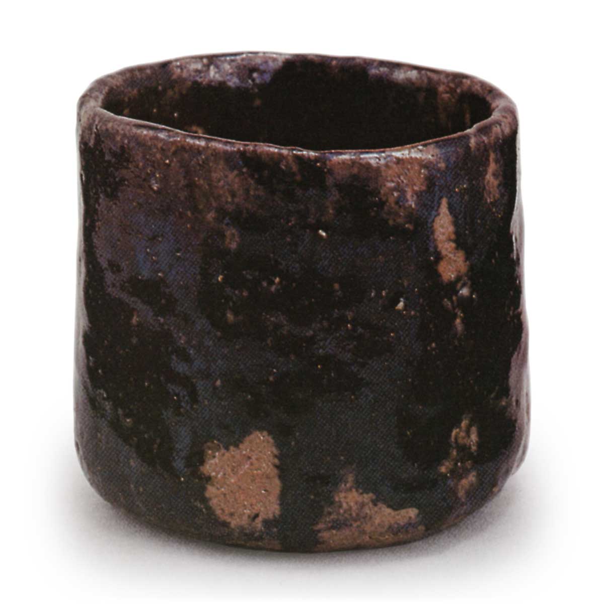 与濑户黑筒茶碗形制相似的茶碗,碗身略微外张,不规则圆形的竹轮状底座随意附着,碗底向内凹陷,底座周围的制作手法颇具趣味。除高台接合处外,通体覆着浓郁的琥珀色釉,釉面光泽柔润。陶土含铁量颇高,烧成后呈现紫褐色胎体。此茶碗较之陶工制品更似雅士手作,尽显雅致风韵,在丹波烧中实属罕见作风。高台边缘环绕着圆润的接合痕迹。