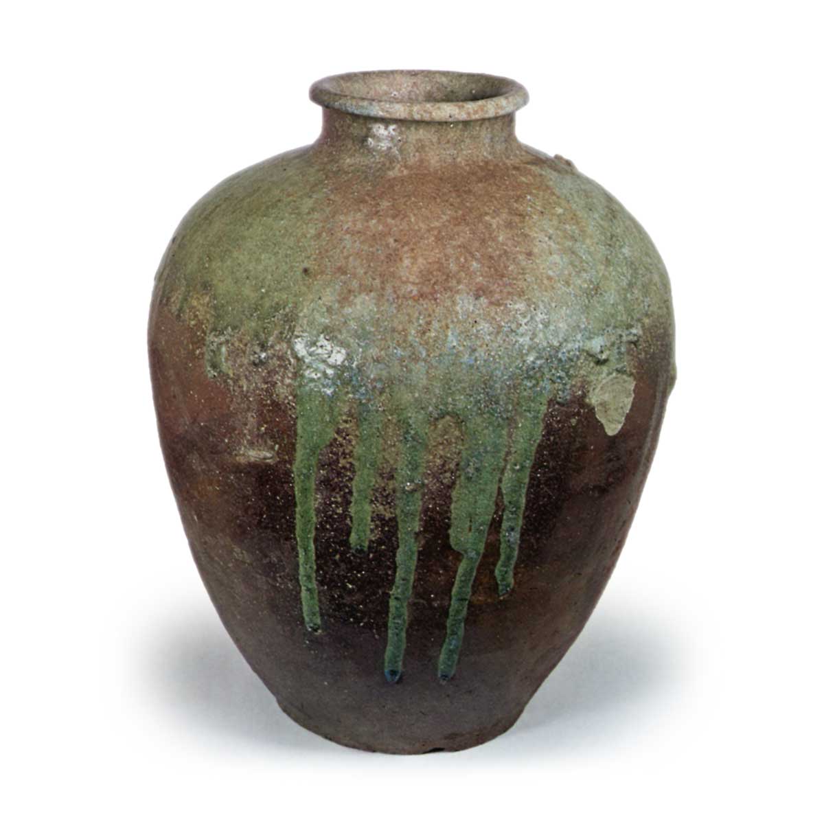 丹波壶 丹波丹波壶 2025.09.15 丹波壶 高45.8厘米 口径14.3厘米 底径17.5厘米此壶口沿呈玉缘状,肩部圆润外展,壶身底部略收束。自口部至壶身覆盖着厚重的草绿色自然釉,釉面流淌出约五道釉料堆叠纹,实为景致绝美的壶器。丹波烧的自然釉色与备前、常滑等不同,因火焰还原作用强烈而呈现偏青的特色,在赤褐色烧结胎体上釉色尤为鲜亮。壶身局部有粘结痕迹,底为平底。此作应属室町时代中期至后期的作品。