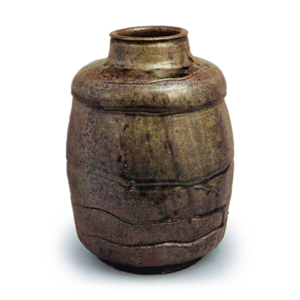 丹波壶 丹波丹波壶 2025.09.15 丹波壶 高17.3厘米 口径12.8厘米 胴径17.8厘米 底径12.3厘米口部边缘饰玉边,肩部收束,胴体微膨,底部呈圆座状。肩部与胴体施笋节纹,自口部至胴体自然釉如流水般流淌。此类器物被推测为后世朝仓山叡壶的早期样式,故称作无印时代的山椒壶。据考应属中世以来客窑末期,即桃山时期的作品。成型采用绳索拉坯法,胎体厚实。伊贺地区亦曾烧制过类似形式的器物。