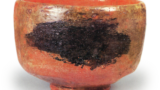 此为典型的鬼桶形水指,器身薄而端正。据推测属于宿窑时代末期,即桃山时代的茶陶器,但此类器型在现存作品中极为罕见。器身饰有细密梳纹,自口部至胴身覆盖着薄薄的灰釉。口沿下方刻有“#”窑印。