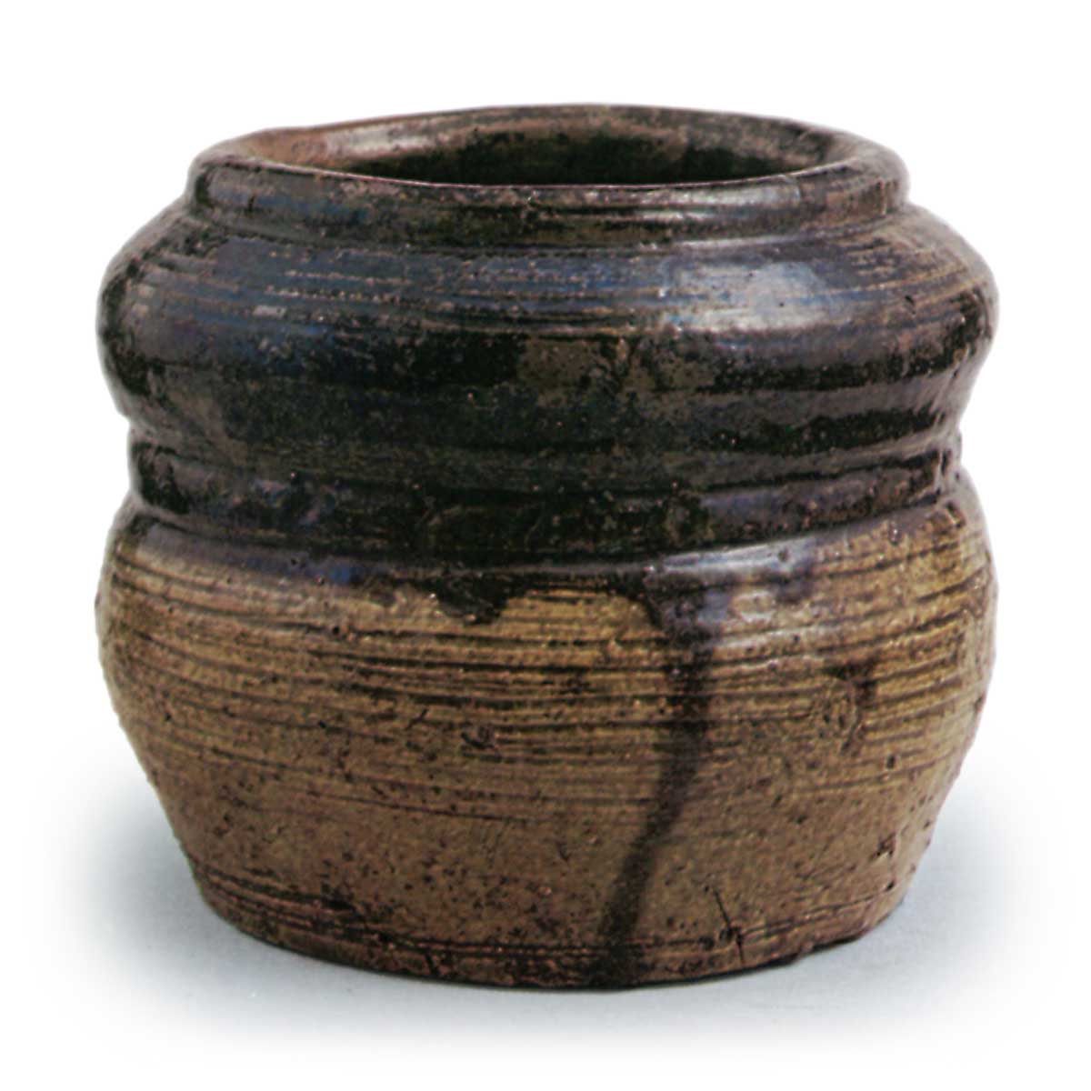 丹波胴绢纹水指 丹波丹波胴绢纹水指 2025.09.172025.11.14 丹波胴绢纹水指 高12.5厘米 口径11.4厘米 底径11.8厘米藤田美术馆此水指口部圆润低起,胴体收束,自肩部至胴底环绕着线状雕刻纹饰。上部施釉为琥珀色,下部为灰釉,内壁露胎处略见灰釉斑驳。此器为江户时代前期制成的水指,或属远州风格茶陶之列。
