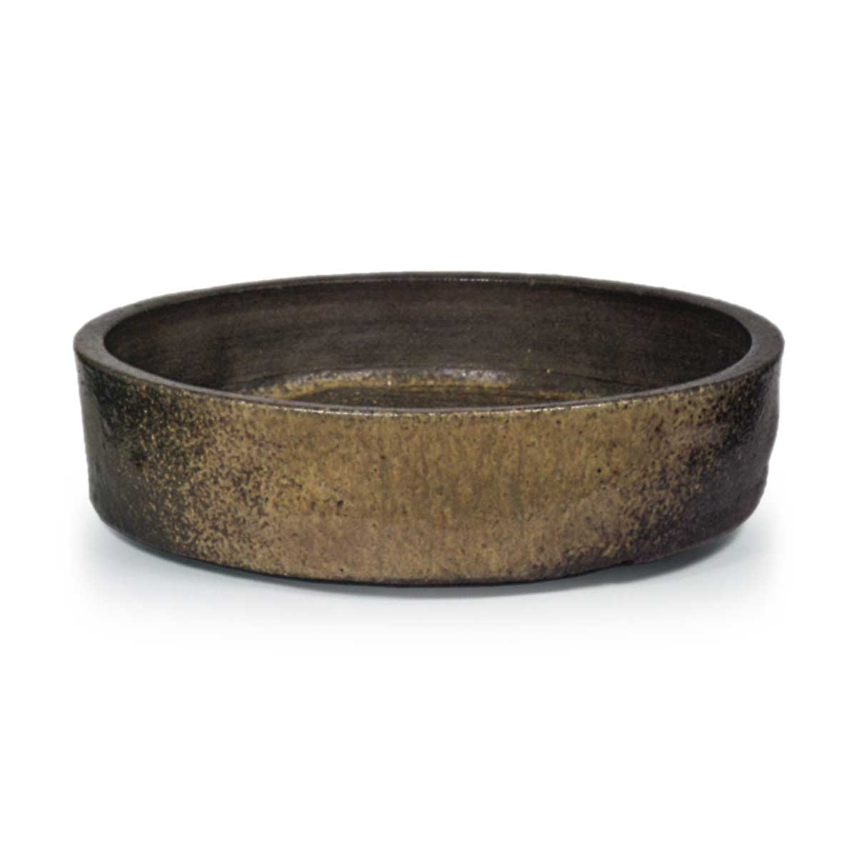 丹波平鉢 丹波丹波平鉢 2025.09.17 丹波平鉢 高7.5厘米 口径33.6厘米 底径32.2厘米此为形似盟器的宽大平鉢,厚实成型。外侧局部覆有黄褐色灰釉,内壁亦薄施釉层。上釉面呈褐色烧结,但内壁与底面出现大小不一的显著火泡。应为江户时代初期作品。