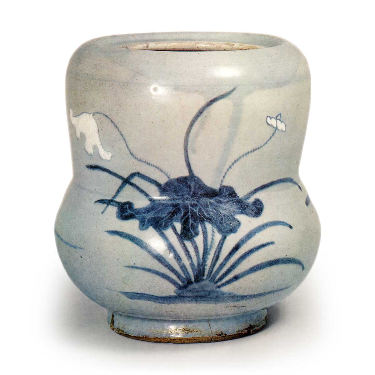 琉璃釉莲纹水指 古伊万里琉璃釉莲纹水指 2025.09.172025.11.14 琉璃釉莲纹水指 高20.8厘米 口径13.3厘米 底径11.7厘米此器形以姥口为口沿造型,肩部圆润抚平,器身收束后呈裾张风,属江户时代初期在唐津、有田一度流行的独特器型,显然是专为水指而制。正面以深色染付与白泥描绘莲花,背面绘制波纹图案,其上全面施以薄瑠璃粕釉,堪称前所未见之作。据推测,此乃百间窑烧制之作,在早期伊万里染付瓷器中亦属特异之作。高台浑厚有力,局部出现山裂纹。此器应属宽永年间(1624-1644)作品。
