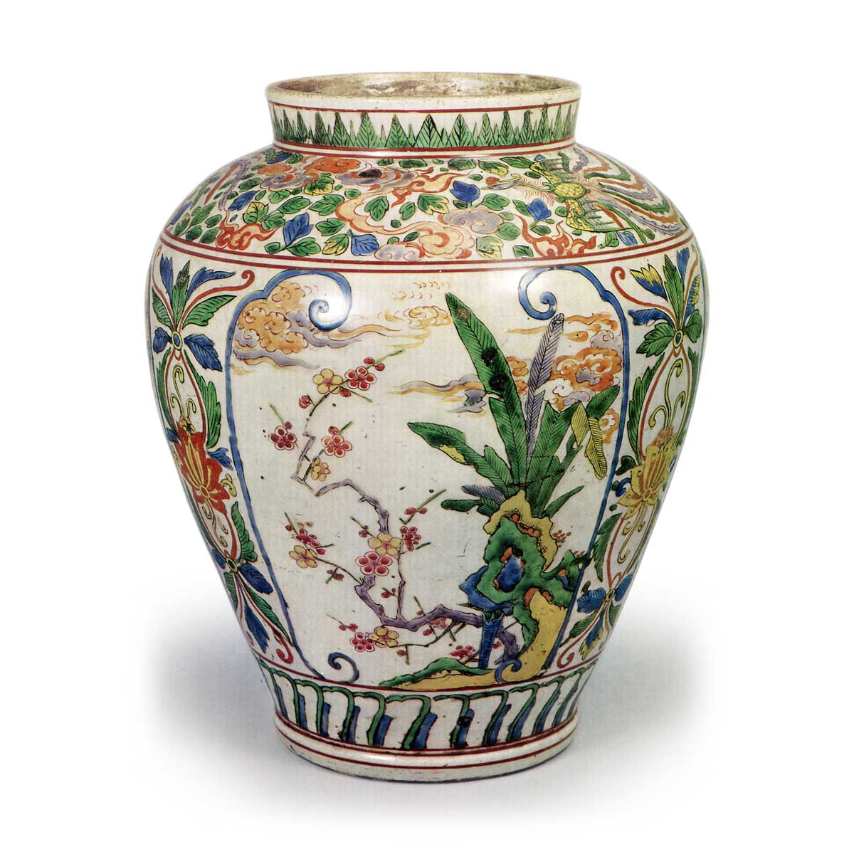色绘梅芭蕉纹壶 古伊万里色绘梅芭蕉纹壶 X Facebook Hatena Bookmark LINE Pinterest 复制 2025.09.17 色绘梅芭蕉纹壶 高33.0厘米 口径15.4厘米 底径15.3厘米东京国立博物馆壶身三面开窗,每面均饰以太湖石上芭蕉与梅花的图样。颈部饰以锯齿状叶形纹,肩部填满飞凤与云纹及细密树叶纹,窗格间则纵向绘有唐草风格的唐花纹。胎体素面可见山状瑕疵,质地略显粗犷,但纹饰描绘锋利,在同类壶器中堪称受南京赤绘影响显著的精品。