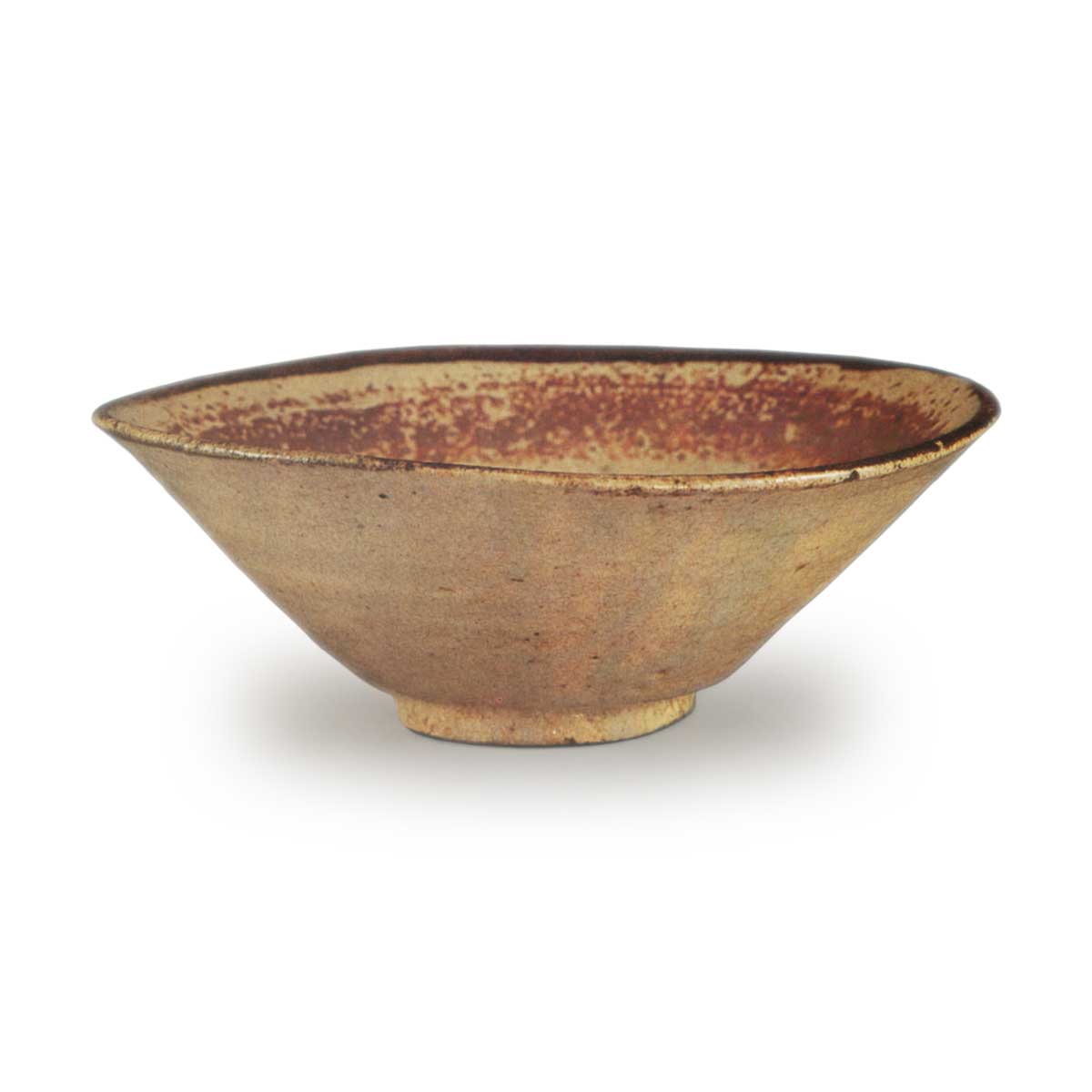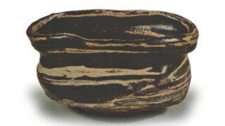 足环没有上釉,而且与通常的唐津风格略有不同,表面粗糙呈白色。形状和大小也相当一致,边缘装饰方式相同,因此可以将其视为一种根据茶道大师的口味制作的正式茶碗。 这款茶碗来自中京地区的织田家族,在茶道界被誉为木碗茶碗中的顶级之作,以其光滑的表面和庄重鲜艳的边缘色脱颖而出。 拿在手里的感觉也很完美,深红色的边缘充满魅力,厚薄部分对比鲜明。边缘的茶渍为蛋壳般光滑的表面增添了美感。