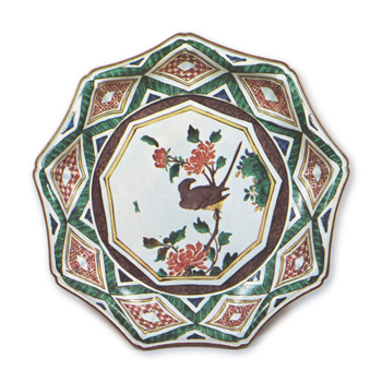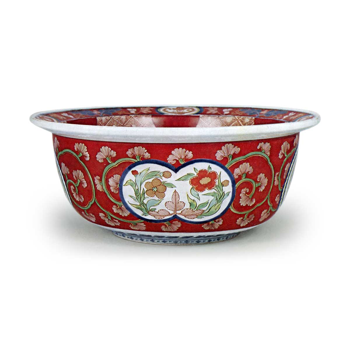 外圈四隅设白底镂空窗格,交错绘制草花与飞凤纹样,底纹则以赤色为地,萌黄彩绘花唐草纹。