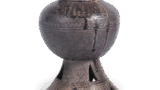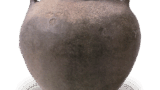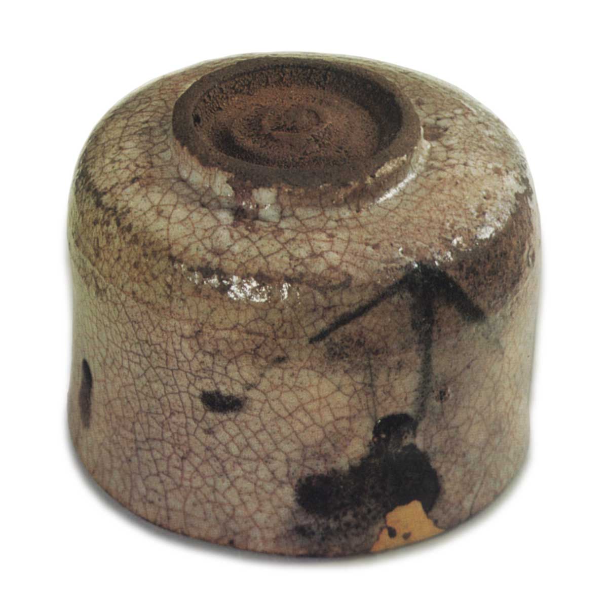 底部敞开,露出粗糙的粘土,并被茶渍染成深色,但最初可能是浅灰白色的粘土。底部中央有一个罩子,周围不是同心圆,而是两组凸起的圆圈。