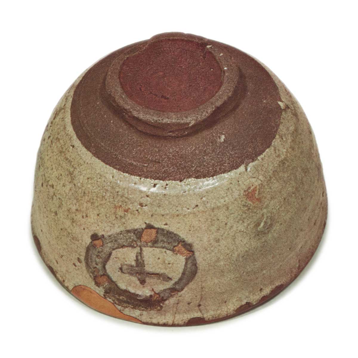 这是一只非常精美的唐津茶碗,碗身以粗笔描绘了一个圆圈内的十字。