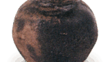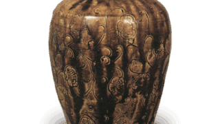陶土是一种粗糙的粘土,混合了细沙,烧制得非常结实。陶土中含有微量的铁,烧制后变成浅棕色,沾染茶渍后颜色更深。 它被一层半透明的白色釉覆盖着,表面布满了裂纹。边缘用铁颜料装饰,俗称“皮鲸”。在身体的两侧,有用铁颜料绘制的带有十字的圆圈,半融化的半透明釉透过来看很漂亮。