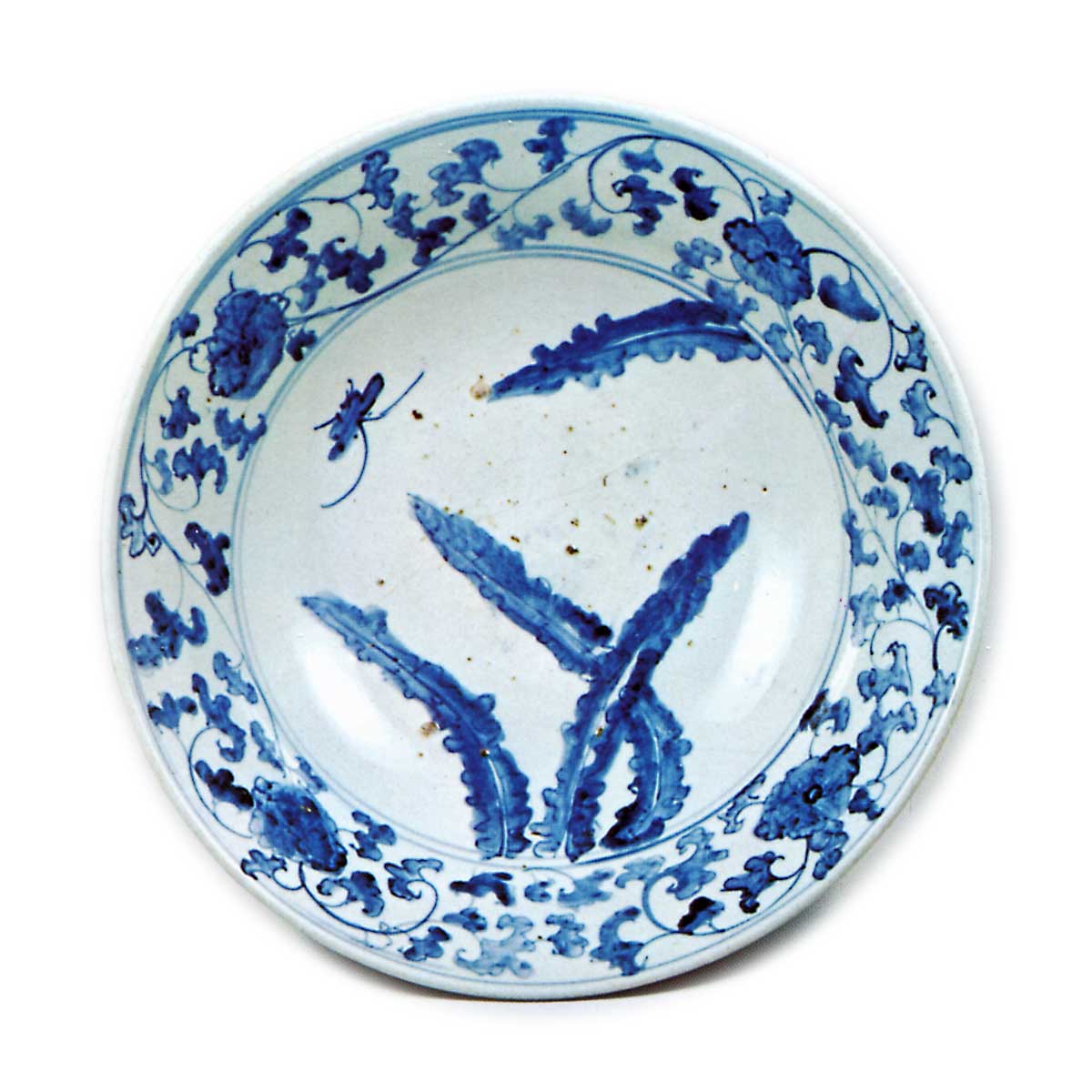 青花草蝶纹大碗 古伊万里青花草蝶纹大碗 2025.09.17 青花草蝶纹大碗 高10.7厘米 口径35.5厘米 底径10.1厘米虽无法辨明叶片种类,但叶尖饰有纹样,其间点缀着一只蝴蝶。环绕四周的牡丹唐草纹饰极为粗放,正是早期青花特有的奔放风格。然而釉面熔融均匀,烧制成精美的白瓷。