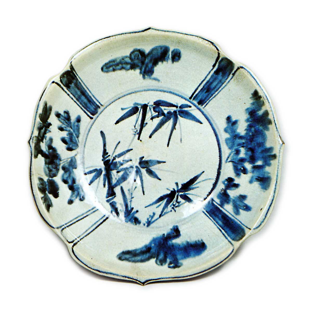 青花竹纹轮花大盘 古伊万里青花竹纹轮花大盘 2025.09.17 青花竹纹轮花大盘 高7.9厘米 口径35.0厘米 底径9.5厘米此为口部呈四瓣花形的大盘,盘面绘有竹纹,四分割的侧面饰以花弄纹,然因青花釉料流淌,纹样已不甚清晰。表面釉层颇厚,呈现泛青的醇釉状态,应为百间窑烧制之作。底面无纹饰。