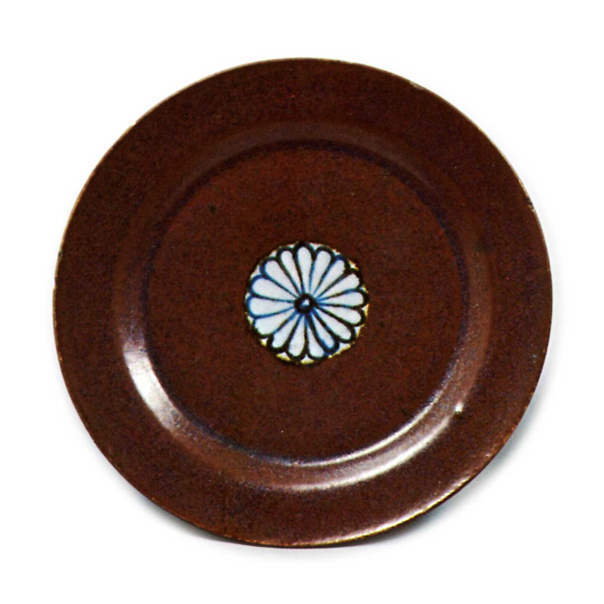 稗古场窑曾出土器形与纹饰完全相同的器物。盘面以青花描绘十六瓣菊花,内外均施铁釉。此为腰部带阶梯状的小碟,高台略显宽大。此类器物通常被称为吸坂手,原被认为是加贺吸坂窑的作品,但由于稗古场窑、山小屋窑等地均出土过陶片,现已证实有田地区亦曾烧制此类器物。