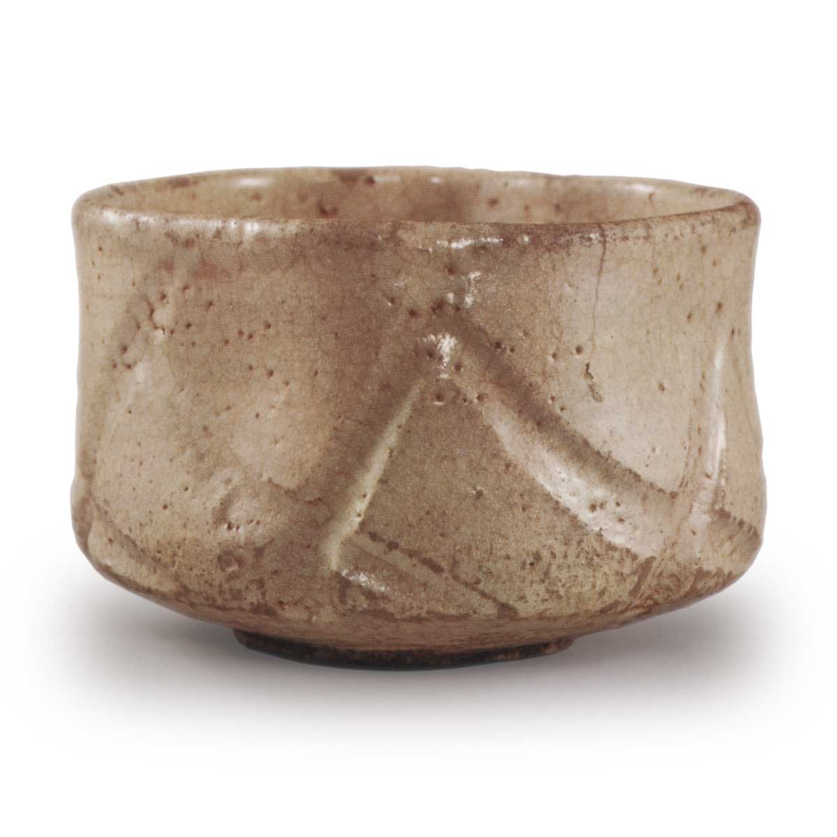 这里最引人注目的特征是厚实、深邃的菱形雕刻,一直环绕着器身。 通常情况下,线条雕刻会使用一种名为“bata”的工具,但在这里,人们认为雕刻可能使用了一种用于刮擦足环的铁钩。通过巧妙地使用钩子尖端的圆形弯曲部分,可以留下用圆边工具深雕的痕迹。 雕刻风格大胆有力,一次刮掉釉面的技巧令人叹为观止。尽管在刻纹上涂了一层相当厚的釉,但阴影仍然深邃,且清晰地在水平和垂直方向上相互交叉。这可能是这个茶碗最令人印象深刻的特点。