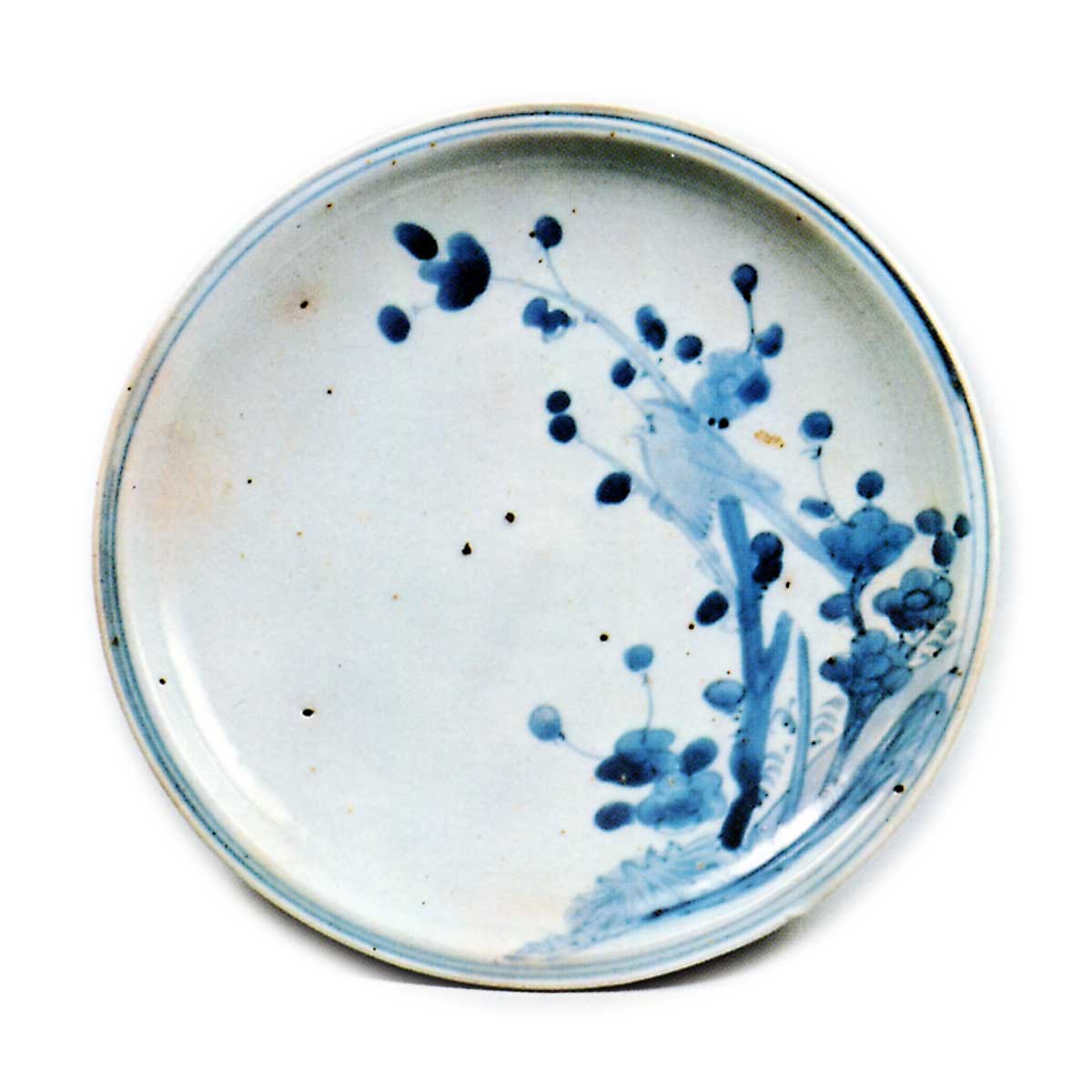 染付梅鶯文皿 古伊万里染付梅鶯文皿 2025.09.18 染付梅鶯文皿 高4.2厘米 口径20.6厘米 高台径8.5厘米此为中型盘,镰刀状边缘呈圆弧状,盘面饰有梅花与鹂鸟图案。可能出自大樽窑。大樽窑遗址曾出土过笔法相似的梅纹盘碎片。