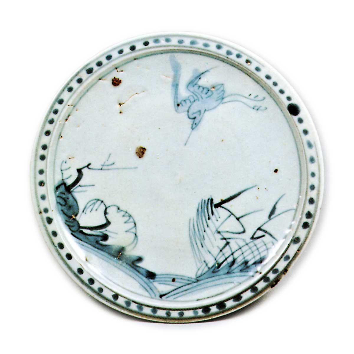 芦鹭纹以轻巧笔触描绘。左侧配以柳树,周围随意点缀着常见于大碗等器皿的点斑纹。