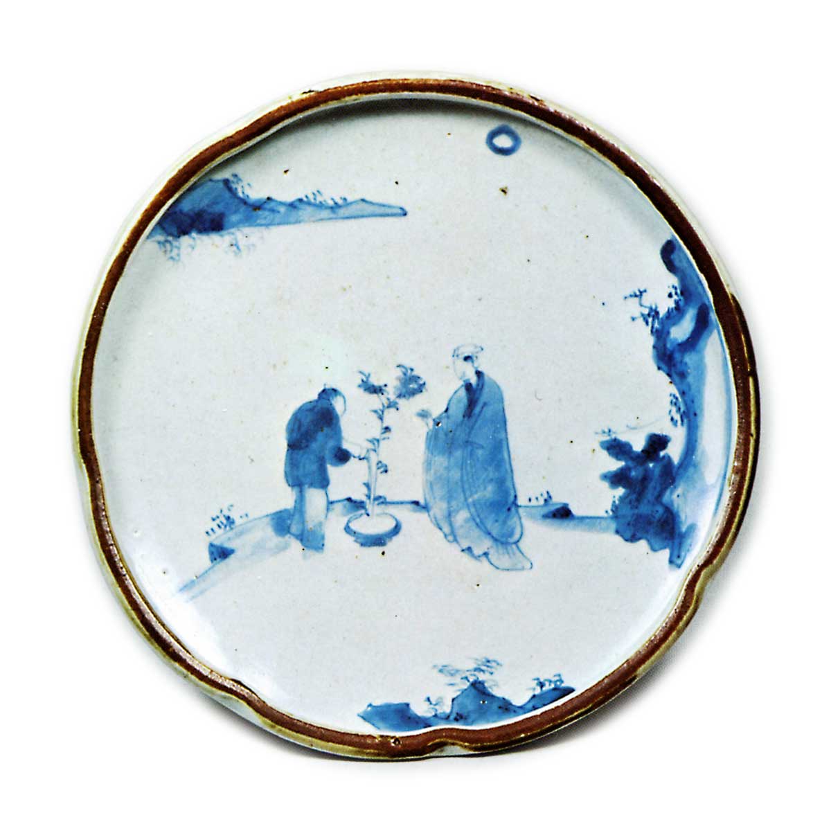 染付人物纹台盆 古伊万里染付人物纹台盆 2025.09.18 染付人物纹台盆 高6.2厘米 口径23.3厘米 高台径7厘米此为有田染付瓷器中最具天启风格的绘饰作品,口沿饰以红釉,底足略高且经削制处理。其图案虽未明确出处,应仍取材于中国典故。整体厚实亦为特色。此类器物曾被称为“蓝九谷”,推测应出自百间窑。器底三面饰有云气纹。