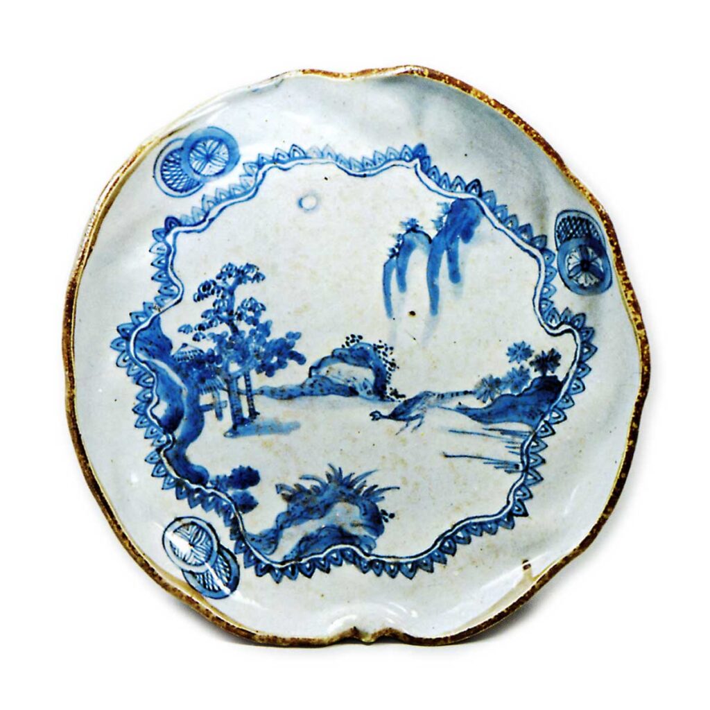 染付山水纹盘 古伊万里染付山水纹盘 2025.09.18 染付山水纹盘 高25.7厘米 口径26.1厘米 三足此盘与前图作风相同,但器形改为叶形,口沿呈不规则歪曲状。盘面绘制山水图景,饰以不规则框线的边饰纹样,三周环绕祥瑞风格纹饰。此器亦属传统蓝九谷范畴,推测应出自百闻窑。底面三足支撑,底背以舒展笔触绘制简洁藤蔓纹。高台内刻有“太明”铭文。