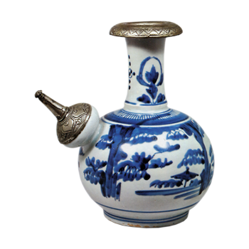 青花人物纹八角盘 古伊万里青花人物纹八角盘 X Facebook Hatena Bookmark LINE Pinterest 复制 2025.09.18 青花人物纹八角盘 高5.6厘米 口径26.4厘米 高台径11.4厘米此为边缘上翘的稍深盘,厚实成型。盘面右侧饰松梅纹样,左侧绘有二人飞翔之图,其具体意象未能明确辨识。虽属蓝九谷手风格作品,推测应出自山边田窑或百间窑。底座低矮呈圆形。