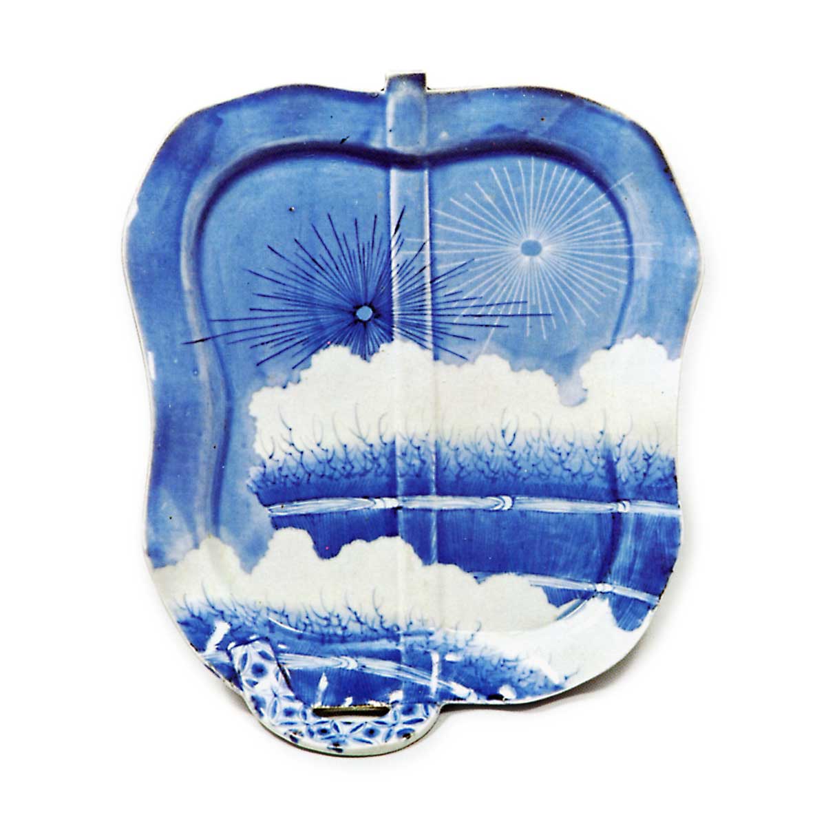 染付柴垣纹军配形盘 古伊万里染付柴垣纹军配形盘 2025.09.18 染付柴垣纹军配形盘 高3.8厘米 口径20.7×24.1厘米 底径13.3×16.4厘米此盘与前图器物完全同类,但器形采用军配造型。仍以琉璃釉为底,白釉勾勒日轮,深青釉绘月轮,象征阴阳之道;下半部以青釉渲染柴垣纹样,其间以纤细笔触描绘柴枝末梢。其青花技法极为精湛,可见延宝年间锅岛烧所创制的高完成度青花之影响。把手饰以七宝纹,底面环绕与前图完全相同的唐草式草纹,高台内以相同字体题刻“大明嘉靖年製”铭文,高台仍为梳纹高台。据推测应为同期同作者所作。