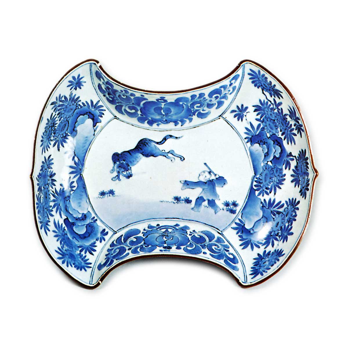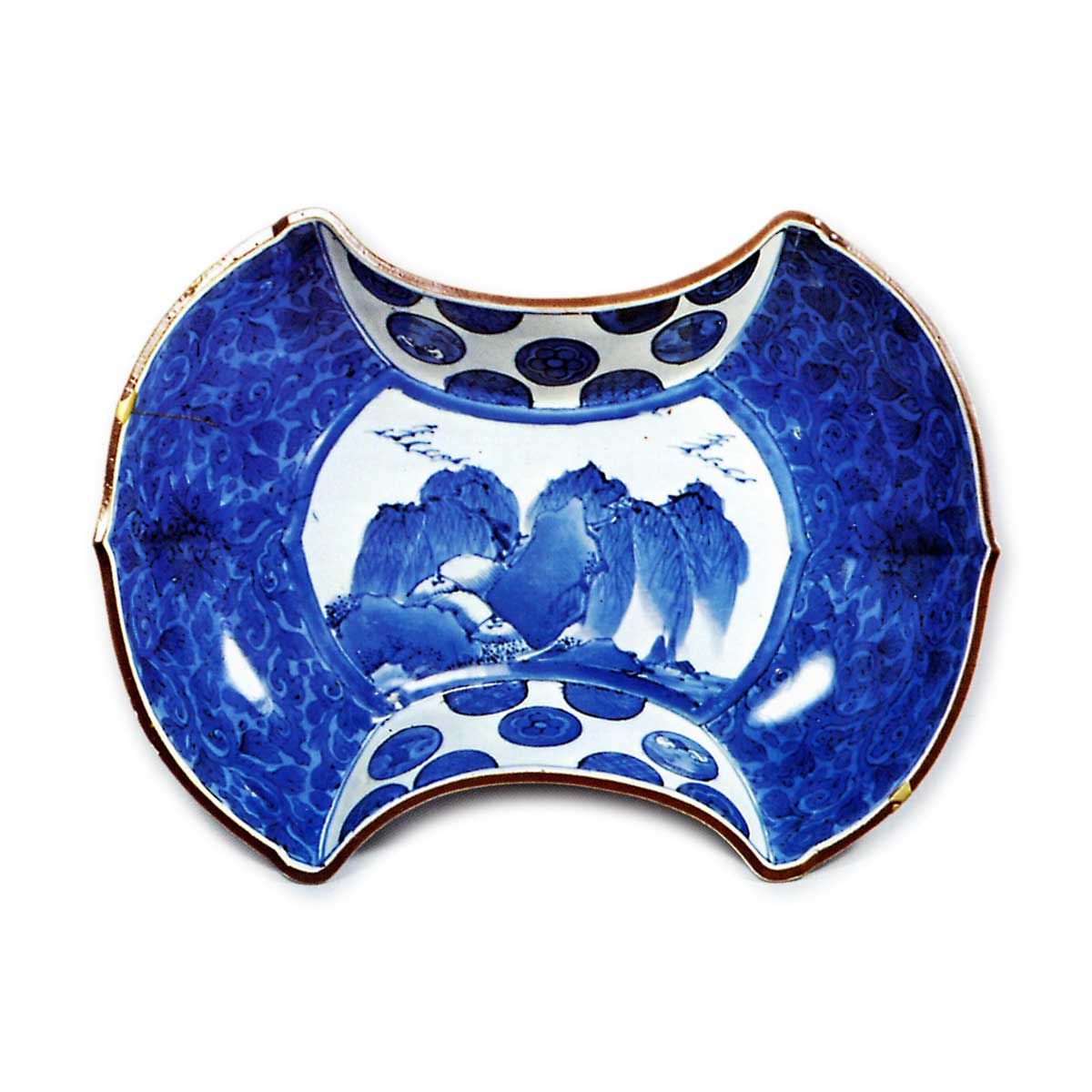 染付砝码形盘 古伊万里染付唐子虎纹砝码形盘 2025.09.18 染付唐子虎纹砝码形盘 染付景观格局砝码形盘 两者均为边缘饰以红色的分铜形稍深平盆。其青花描绘皆极为优美,应属延宝至元禄时期——有田青花技术达到巅峰时期的作品。其韵味与锅岛青花相似,亦与柿右卫门风格的青花存在共通之处。染付唐子虎纹分铜形盆于高台内刻有角福铭,沿口饰折枝式唐草纹,高台外侧环绕雷纹系带。染付山水纹分铜形盆同样在高台内刻有角福铭,高台侧面环绕着以花卉为中心的唐草纹饰,其描绘手法与古九谷大皿背面所见纹样如出一辙。这些器物曾被部分茶道爱好者称为“蓝九谷”,实则并非九谷烧制,而是有田烧作品。