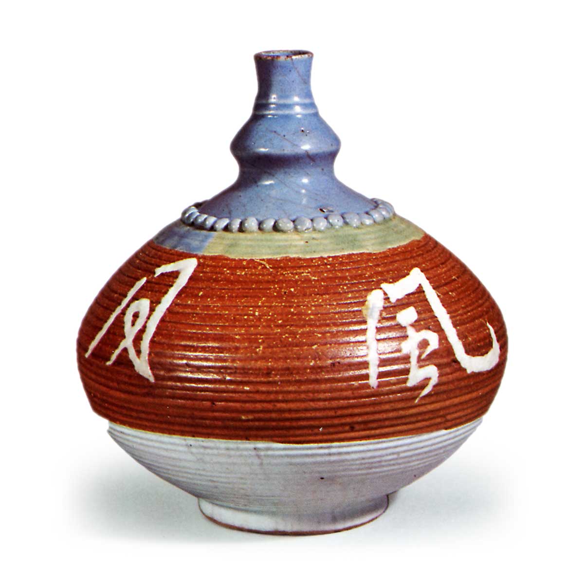 琉璃青瓷铁釉花鸟风月字瓶 古伊万里琉璃青瓷铁釉花鸟风月字瓶 2025.09.18 琉璃青瓷铁釉花鸟风月字瓶 高20.5厘米 胴径19.0厘米此乃极为罕见的器型。山下朔郎先生著作《初期伊万里》中亦仅记载一件同类器物。此为胴部强力膨胀的异形葫芦形酒壶,肩部环绕圆形连珠状浮纹,胴身饰以丝目风格的筋纹。器口至肩部施琉璃釉,肩部环绕细腻青瓷釉,其上覆以铁釉,瓶身以白釉描绘“花鸟风月”字样。此作融合有田烧多元技法实属罕见,然其烧制地尚无定论。制作年代推测为宽永年间之后,具体时期亦难考证。