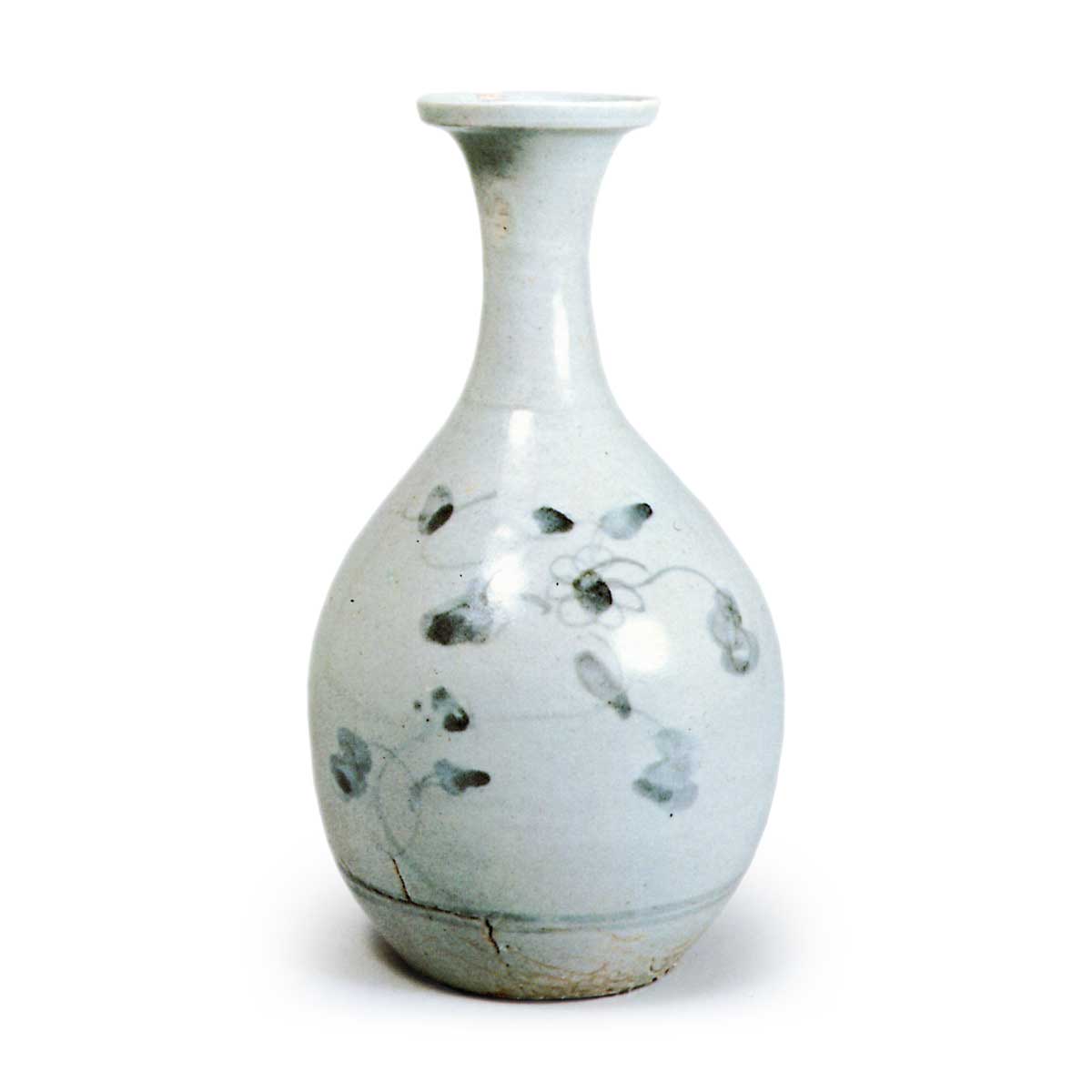 染付蔓草纹酒壶 古伊万里染付蔓草纹酒壶 2025.09.18 染付蔓草纹酒壶 高20.8厘米 口径5.6厘米 胴径11.2厘米 底径6.5厘米此类在器身饰以简朴蔓草纹的酒壶,在初期伊万里染付瓷器中亦属创制初期常见之作。其器形明显承袭自文禄、庆长时期唐津烧制的酒壶造型,以口沿厚实、瓶身饱满者为佳。据考证此器出自上白川天狗谷窑,同类器物的碎片亦曾于窑址出土。