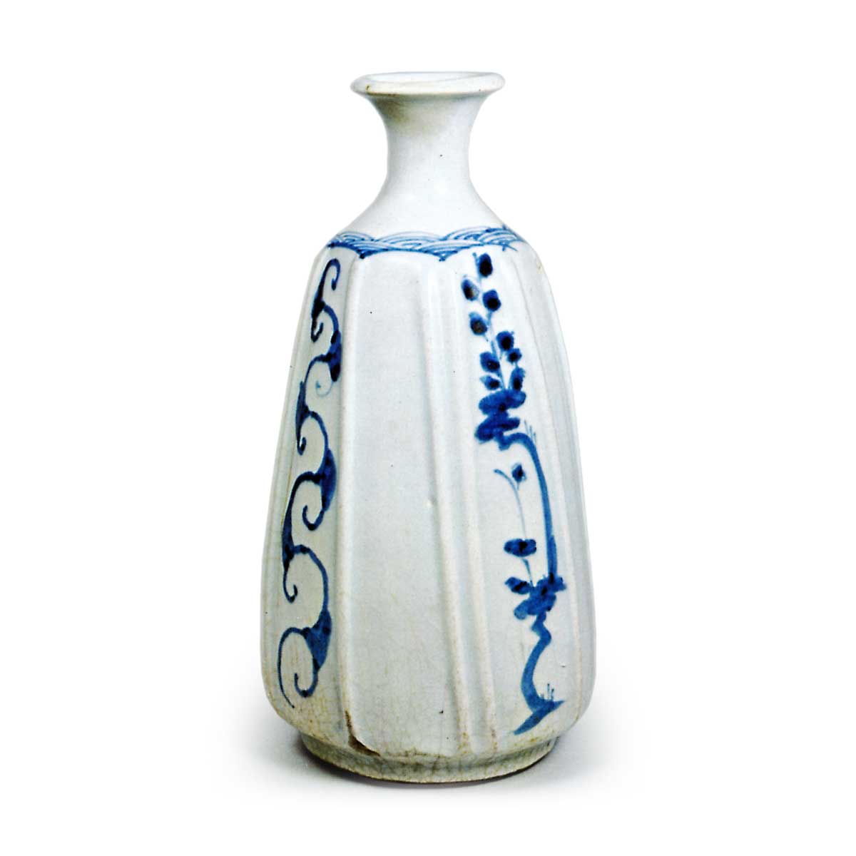 染付梅唐草文酒壶 古伊万里染付梅唐草文酒壶 2025.09.18 染付梅唐草文酒壶 高20.7厘米 口径4.4厘米 底径7.4厘米此类酒壶陶片出土于百闻窑,其胴部饰有两道略粗的堆线纹,间以折枝纹与唐草风纹样。此器曾被认为是李朝青花瓷,但因百闻窑出土陶片佐证,现已确认为早期伊万里青花瓷。推测应烧制于宽永年间。自高台至裙部可见早期器物特有的粗犷釉裂纹。青花色泽浓郁,采用优质钴蓝烧制而成。