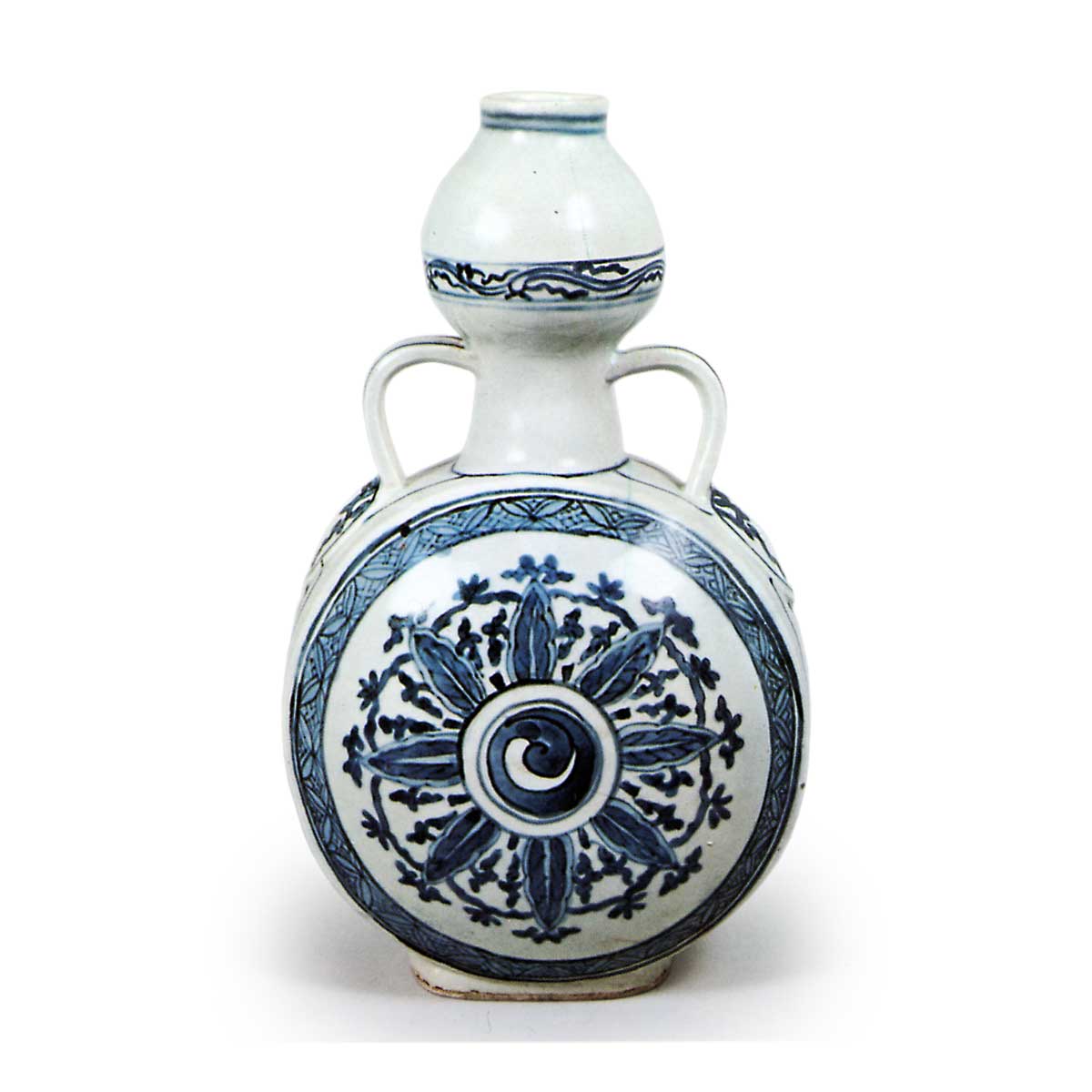 青花唐花纹瓢形耳扁壶 古伊万里青花唐花纹瓢形耳扁壶 2025.09.18 青花唐花纹瓢形耳扁壶 高27.2厘米 口径3.9厘米 胴径16.2厘米 底径6.1×7.9厘米此作宛如明初至宣德年间瓢形扁壶的复刻之作。显然是仿照此类明初青花瓢形扁壶制作,实属前所未见之珍品。然而细察青花釉色、胎体质地等细节,其特征完全符合伊万里瓷器特征,未来或有同类器物出土。尤其壶身以巴纹为核心的八瓣花纹,以及环绕边缘的圆形七宝地纹,皆具伊万里瓷器典型表现手法。壶身侧面饰有唐草纹样。制作年代虽不明确,但亦可推断为宽文年间(1661-1673)以前。