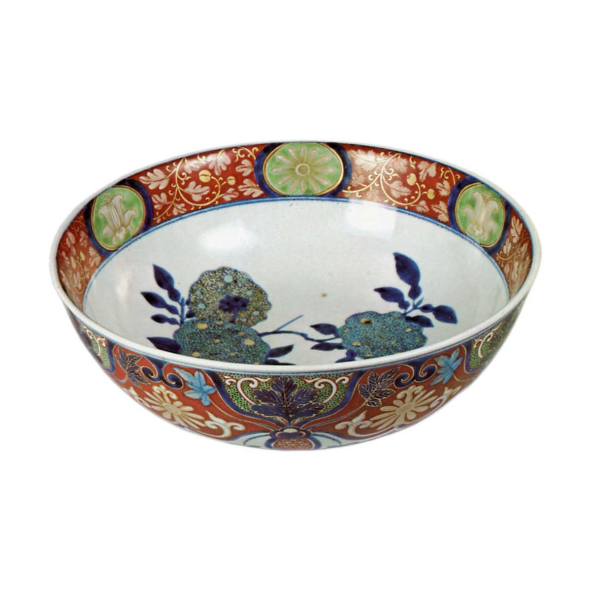 彩绘柚纹盆 古伊万里彩绘柚纹盆 2025.09.20 彩绘柚纹盆 高8.5厘米 口径24.6厘米 底径11.4厘米此为伊万里器型中罕见的盆器,底座低矮,碗形轮廓舒展挺拔。碗内侧以白釉为底,用青、黄等色鲜明描绘大型柚子枝叶纹样;碗沿六面开窗饰以菊牡丹纹,底色为赤釉,以白釉勾勒金彩唐草纹;外侧六面区块内绘唐花纹,其间点缀菊花纹样。此乃伊万里型器独具的华美配色。高台内中央以青花绘制单圈圆环,留有单处烧痕。伊万里型器中此类形式的器物俗称“准型物”,然其与“本型物”的区分标准及起源时期尚不明确。