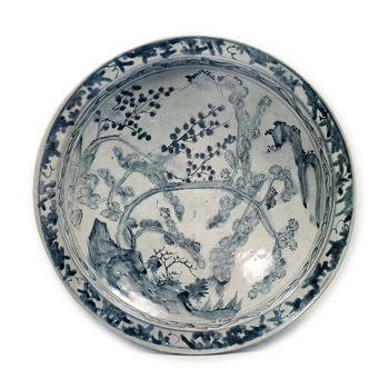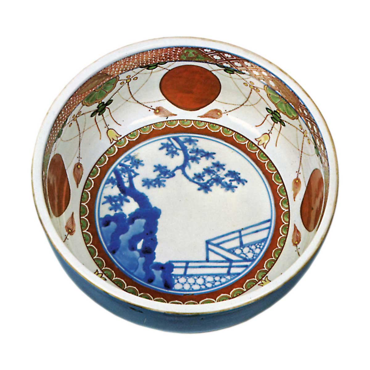 色绘琉璃釉赤玉纹盆 古伊万里色绘琉璃釉赤玉纹盆 X Facebook Hatena Bookmark LINE Pinterest 复制 2025.09.20 色绘琉璃釉赤玉纹盆 高8.9厘米 口径21.0厘米 底径2.5厘米梅沢纪念馆碗内侧中央圆窗内饰栏杆与岩石间合欢树纹样,内圈环堵纹饰四隅点缀红玉纹,外圈则采用全蓝釉地,实属罕见作例。高台内侧双重圆圈内刻有“大明万历年制”铭文。口沿原施金彩装饰,现已几乎剥落殆尽。