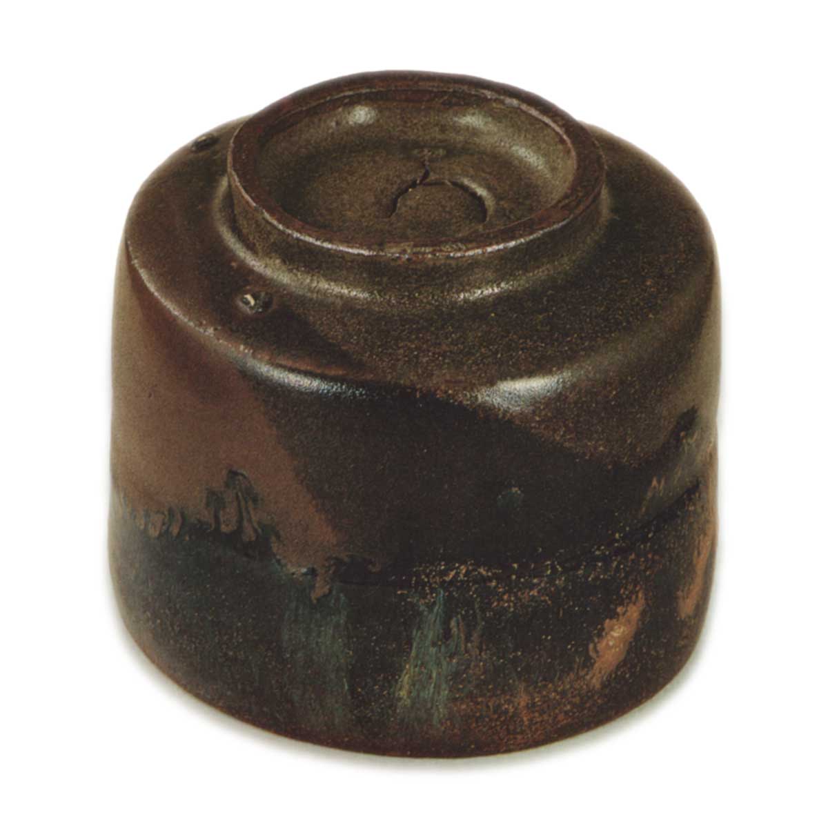 一条绳状装饰环绕在器身的中央,使器形呈现出一种庄严的张力。 黑、棕、灰三种釉料结合的釉面设计以及“笠悬”(一种以条纹形式施釉的技术)营造出一种庄重而优雅的效果,而流过两侧的白色釉料和顶部装饰的圆点则精致无比。 足环也坚实厚重,除了略微厚实的结构和朴素的釉色外,没有丝毫轻浮之感。它保留了早期风格的和谐,同时又不失优雅,这一点值得称赞,在这里我们可以看到旧萨摩烧的真诚。 底座有裂痕,底座和侧面也有裂痕。
