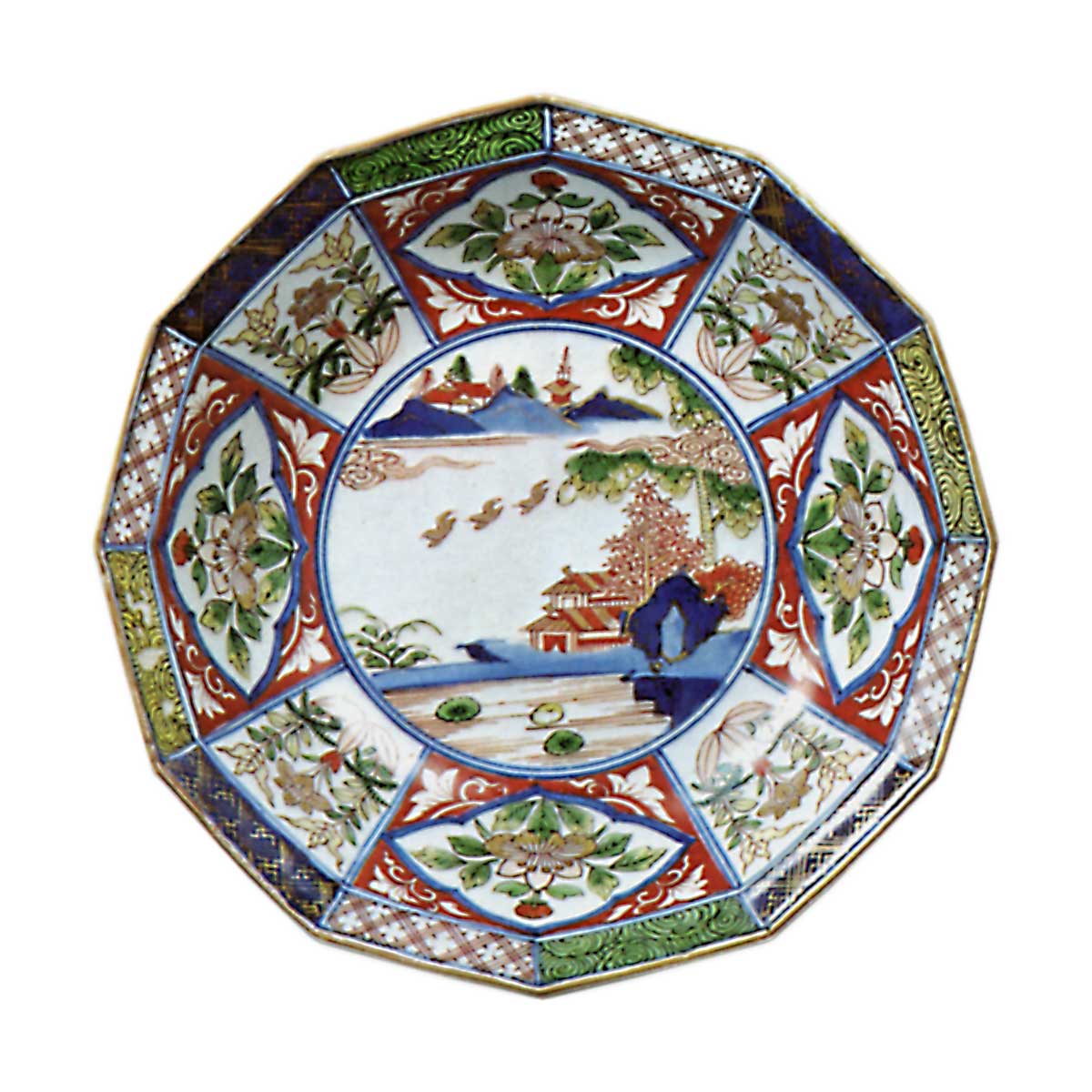 色绘楼阁山水纹盆 古伊万里色绘楼阁山水纹盆 X Facebook Hatena Bookmark LINE Pinterest 复制 2025.09.20 色绘楼阁山水纹盆 高6.2厘米 口径24.4厘米 底径12.7厘米此为铎形口沿的十二角盆,内侧圆窗内饰山水楼阁纹样,四隅内侧以大块留白为底,嵌菱花窗格,窗内绘草花纹;间隔的小窗格亦以白地描绘草花。外圈四隅饰红底白描菱花纹,内含唐花纹样,间隔处以嫩黄与赤红勾勒唐草纹。高台内刻双重圆纹。