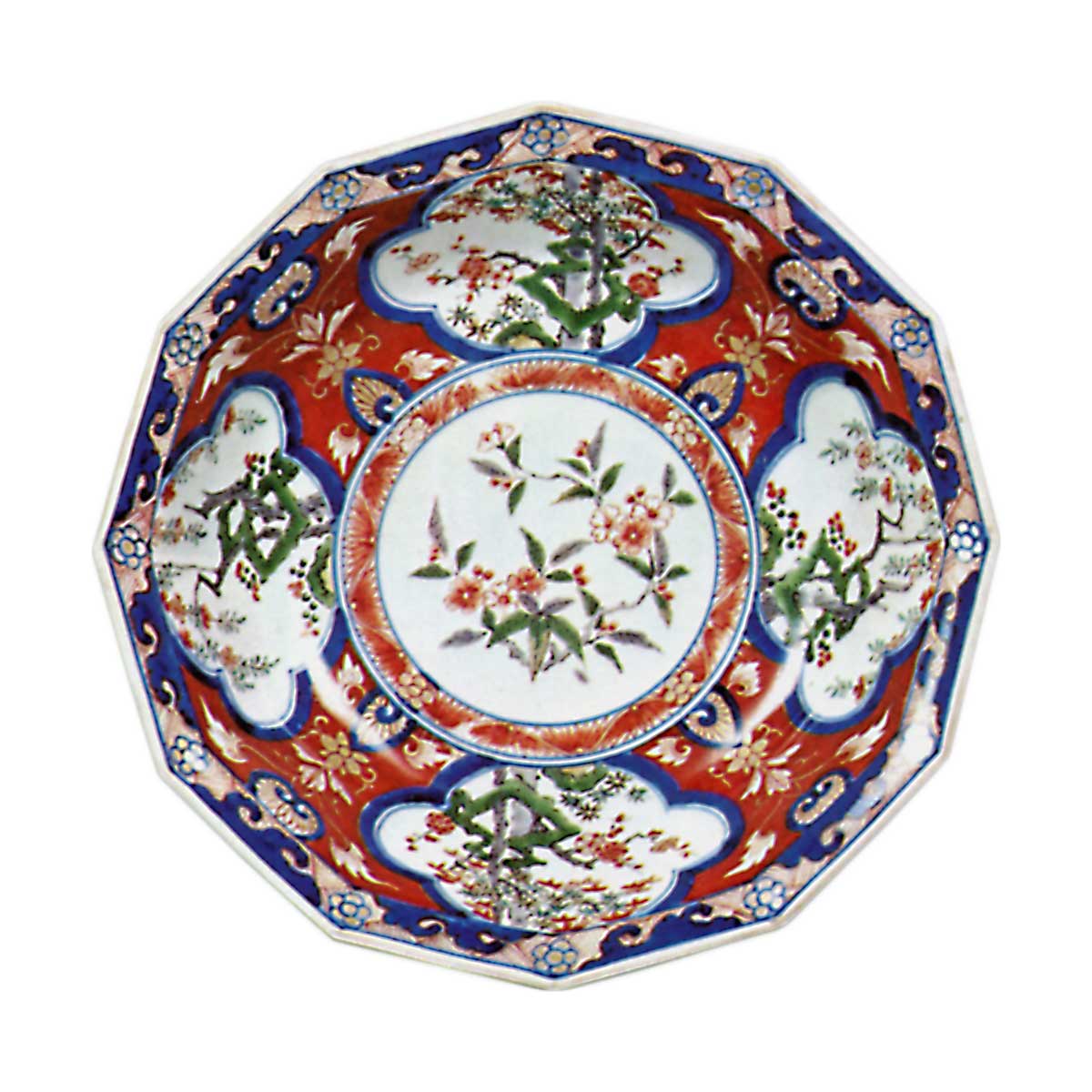 色绘花秀纹盆 古伊万里色绘花秀纹盆 2025.09.20 色绘花秀纹盆 高6.6厘米 口径24.4厘米 底径12.2厘米此亦为十二角盆,盆面中央圆窗内饰折枝樱花纹,四面木瓜形窗格内各饰垂枝樱两枝、梅枝两枝,间以红地唐花纹为饰。外圈三面饰以框线唐花纹,间隙处以藤蔓纹样绘垂枝樱。高台内双重圆圈内刻有“富贵长春”字样。