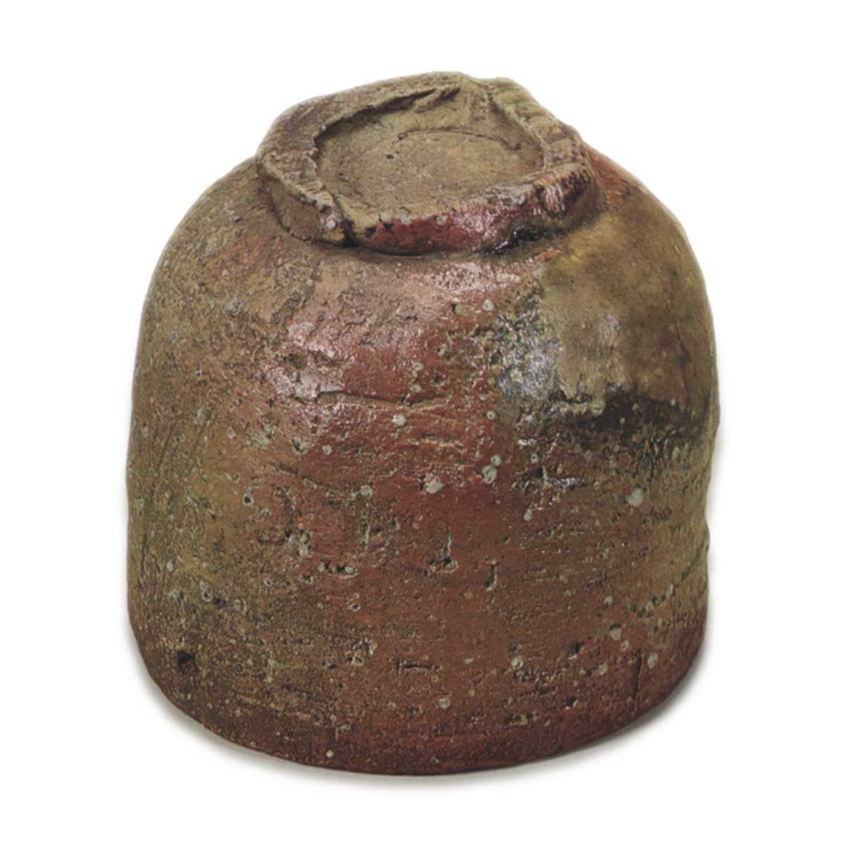 这是一个圆柱形的茶碗,因为是信乐烧,所以一开始就很厚,虽然可以看到陶轮在器身上的痕迹,但乍一看却有一种粗糙的手工制作感。 虽然信乐烧不使用釉料,但表面的纹理更加有趣,红与黄褐色之间的微妙色彩变化也令人着迷。 此外,由粘土中的长石颗粒融化而成的白色釉料散布在器皿各处,白色釉料在红色器皿上反射出大小不一的光斑,格外美丽。 这是这件作品的主要亮点,也是它被命名为“水子”的原因。上笔痕迹隐约可见,但这是为了平滑器皿表面,而不是像后来的仿制品那样,为了装饰而刻意为之。实际上,它反而增加了这件作品的自然魅力。 足环也是一样,这是一个假的足环,但不小心缠绕的绳子恰好形成了一个扭曲的四边形,充满了魅力。边缘还有灰烬,已经变得光滑,形成了一个场景。