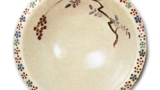 色绘寿字盆 古伊万里色绘寿字盆 2025.09.20 色绘寿字盆 高6.0厘米 口径22.1厘米 底径12.4厘米此为口部外展的牵牛花形盆,内径略宽。中央以青花绘制“寿”字,内侧心叶形镂空窗内饰桃、佛子柑等纹样,四隅则以白镂窗内分别配饰八宝纹。胎体采用琉璃釉底,以金彩精细描绘纹样。外圈四隅饰红地圆纹,间隙以叶纹与唐花纹填补。高台内侧中央书写双重角福铭。