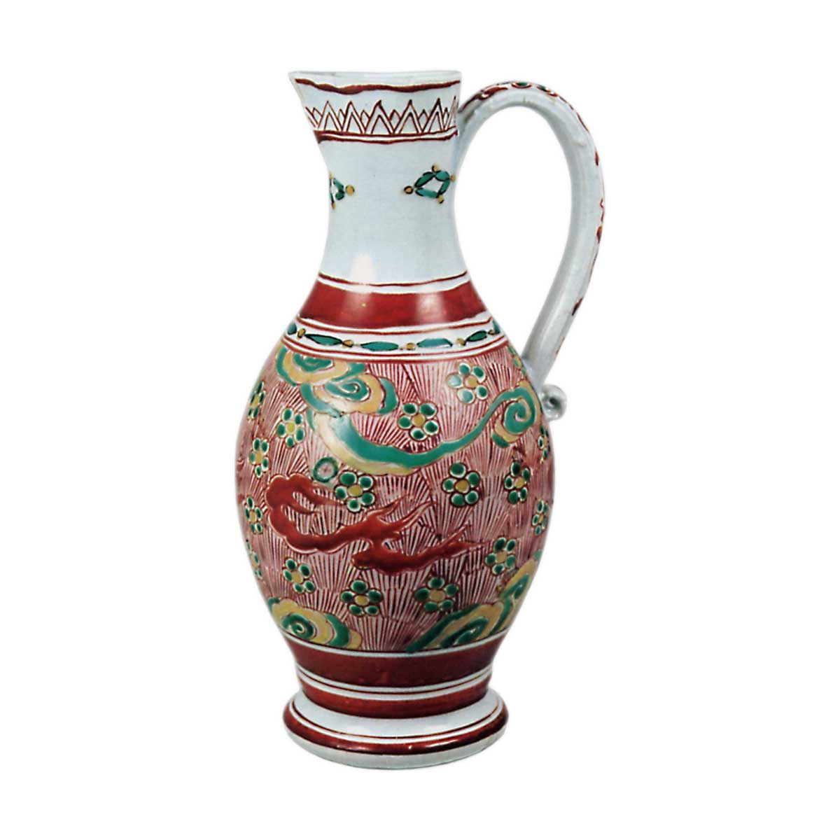 英国藏有与本品完全相同的器物,其口部金属配件上刻有1671年(即宽文十一年)年号,故可明确断定此器为宽文十一年前出口欧洲之作。该发现由前大英博物馆东方部主任索姆·詹宁斯先生公布。因其作风与部分传统古九谷作品相似,詹宁斯先生据此判定古九谷实为有田烧制。由此可见,此器不仅是推测宽文年间前期外销瓷的重要依据,亦为研究古伊万里与古九谷提供了关键资料。虽为近年从欧洲购入之作,然其器形特征已然昭示此乃应欧洲订单特制之物。器身饰以云纹与梅鉢纹,间以细密线描地纹。肩部与器底环绕红色线条,此乃此类古伊万里瓷器最显著的特征。
