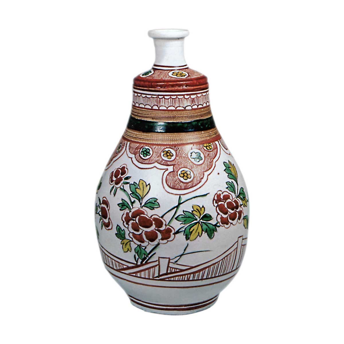 色绘牡丹纹酒壶 古伊万里色绘牡丹纹酒壶 2025.09.20 色绘牡丹纹酒壶 高25.8厘米 口径3.7厘米 底径8.3厘米此图亦属茶男形酒壶的代表作,瓶身环绕高栏与牡丹纹样,其上饰以源氏云纹,云内以线描技法勾勒梅鉢丸纹与斜线纹。虽现存数件同类设计器物,然仍可辨识为出口商品系列作品。