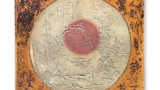 本图亦属典型的出口用古伊万里赤绘瓷器,据推测烧制于1680至1690年代,即贞享至元禄年间。盘面中央描绘插有牡丹的花瓶,两侧配以插有石竹与菊花的瓶子。盘缘饰以菊花与牡丹,并点缀飞凤纹样。其独特纹饰推测为应订单要求绘制。盘体采用带腰段的器形,青花色泽浓郁。盘底无纹饰。